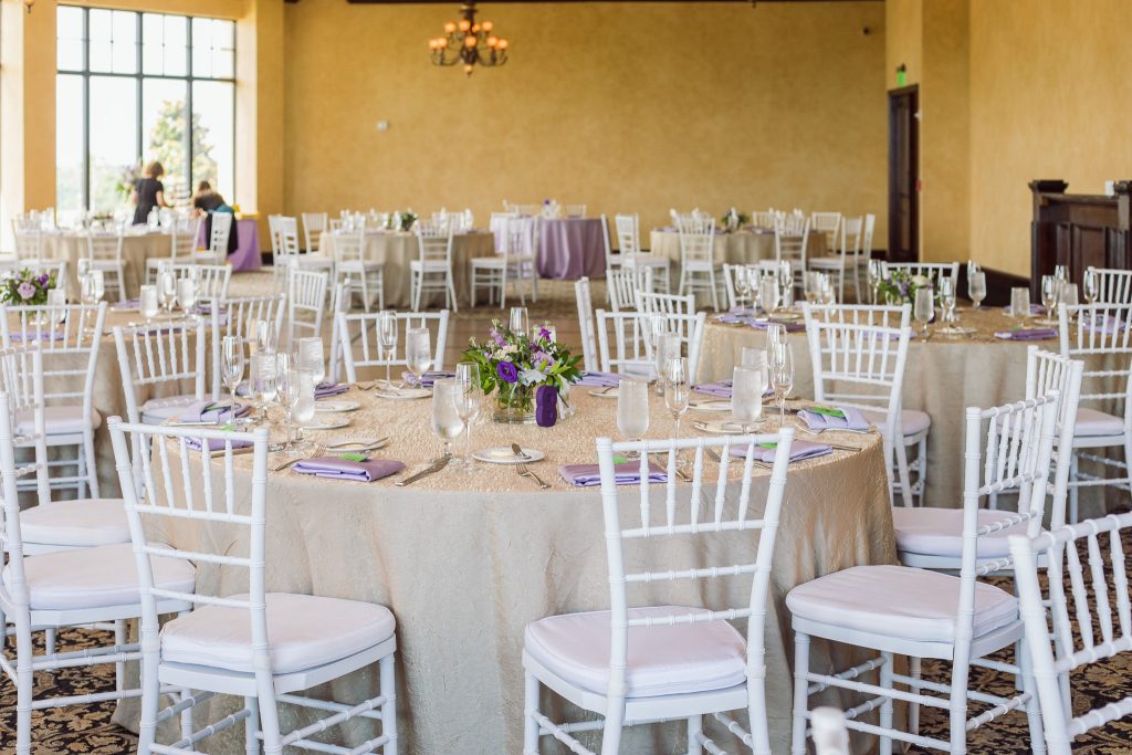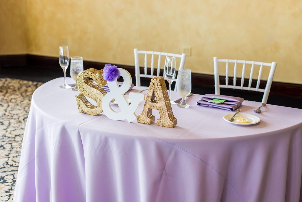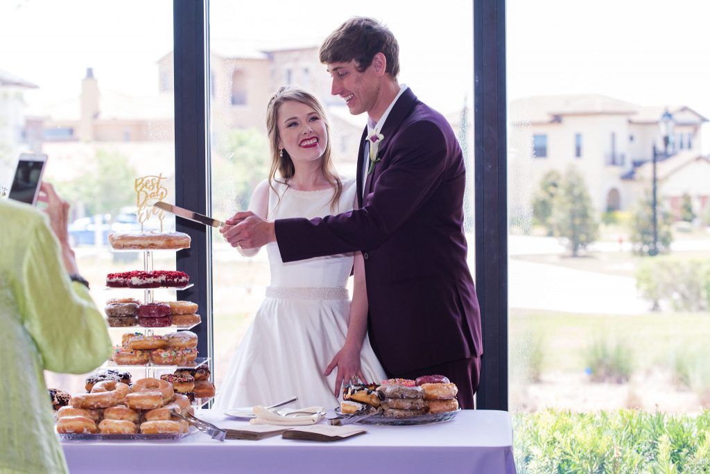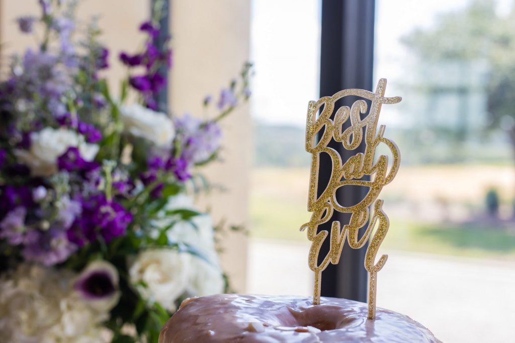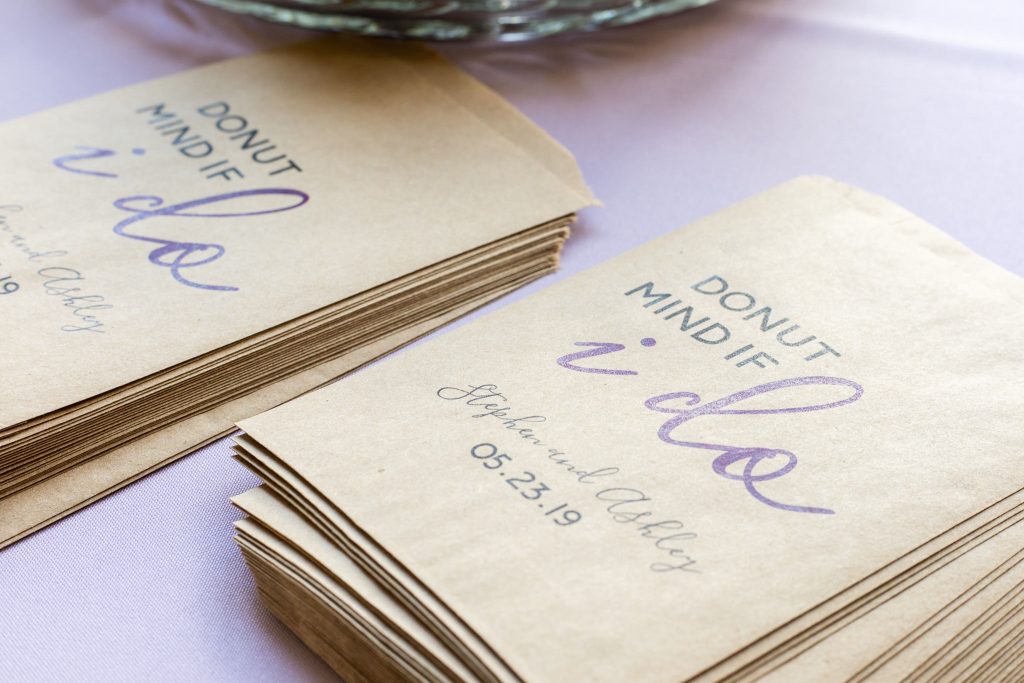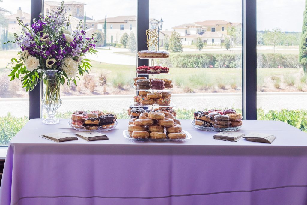 Guests then made their way to Bella Collina, where cocktail hour was set up. They signed the fun guestbook, which entailed leaving a colored thumbprint on a tree. Meanwhile, inside the ballroom, the reception was prepared with a room full of purple and white details. Each table had a gold centerpiece with a line from the “Love is Patient, Love is Kind” verse, as well as floral decor from Lavender and Lace. At the back of the room was the dessert table, holding a tower of donuts as an alternative wedding cake. We thought this was the perfect choice for a daytime brunch wedding!
