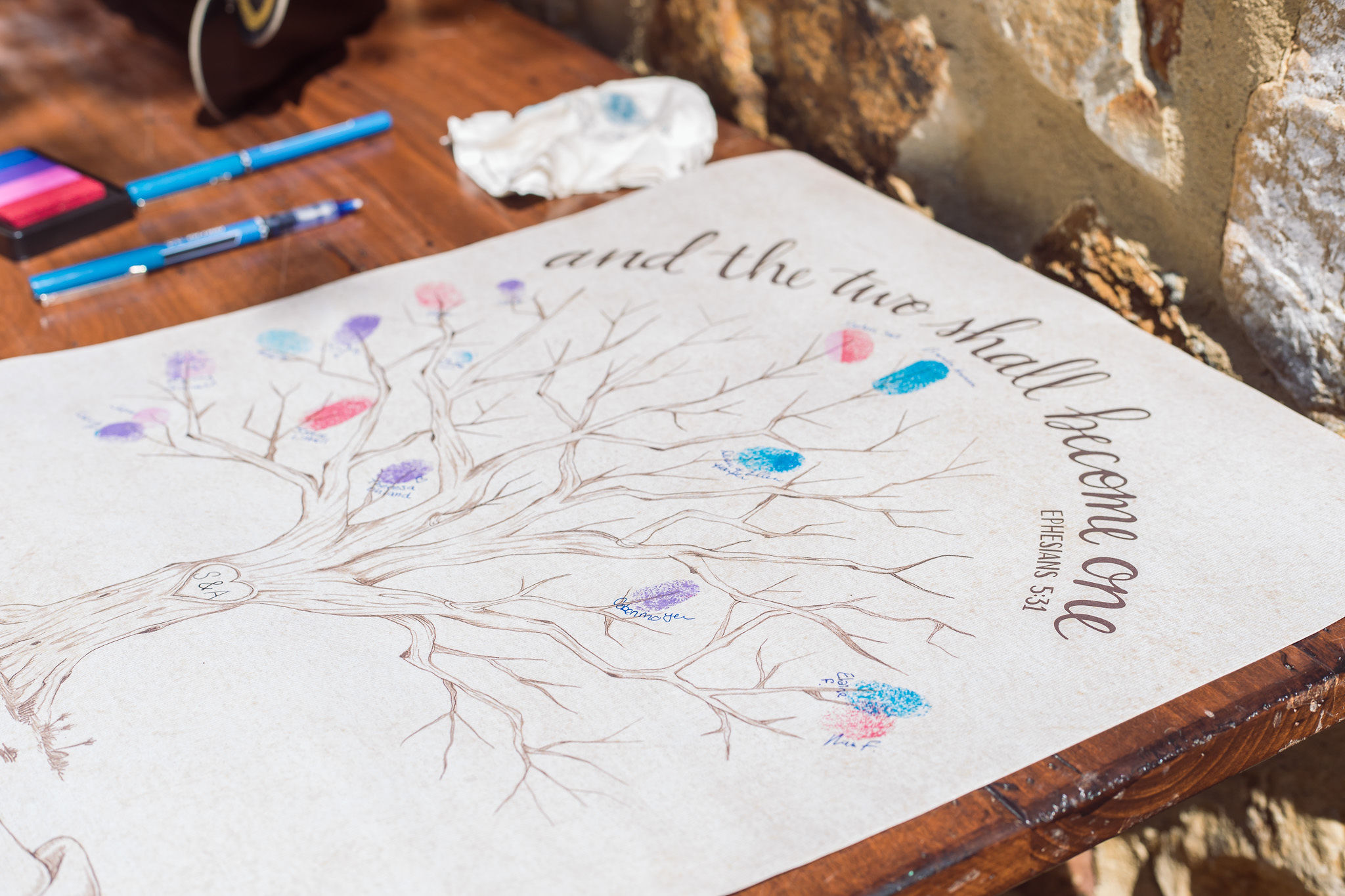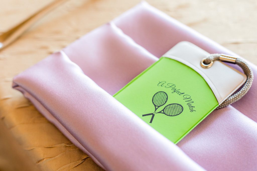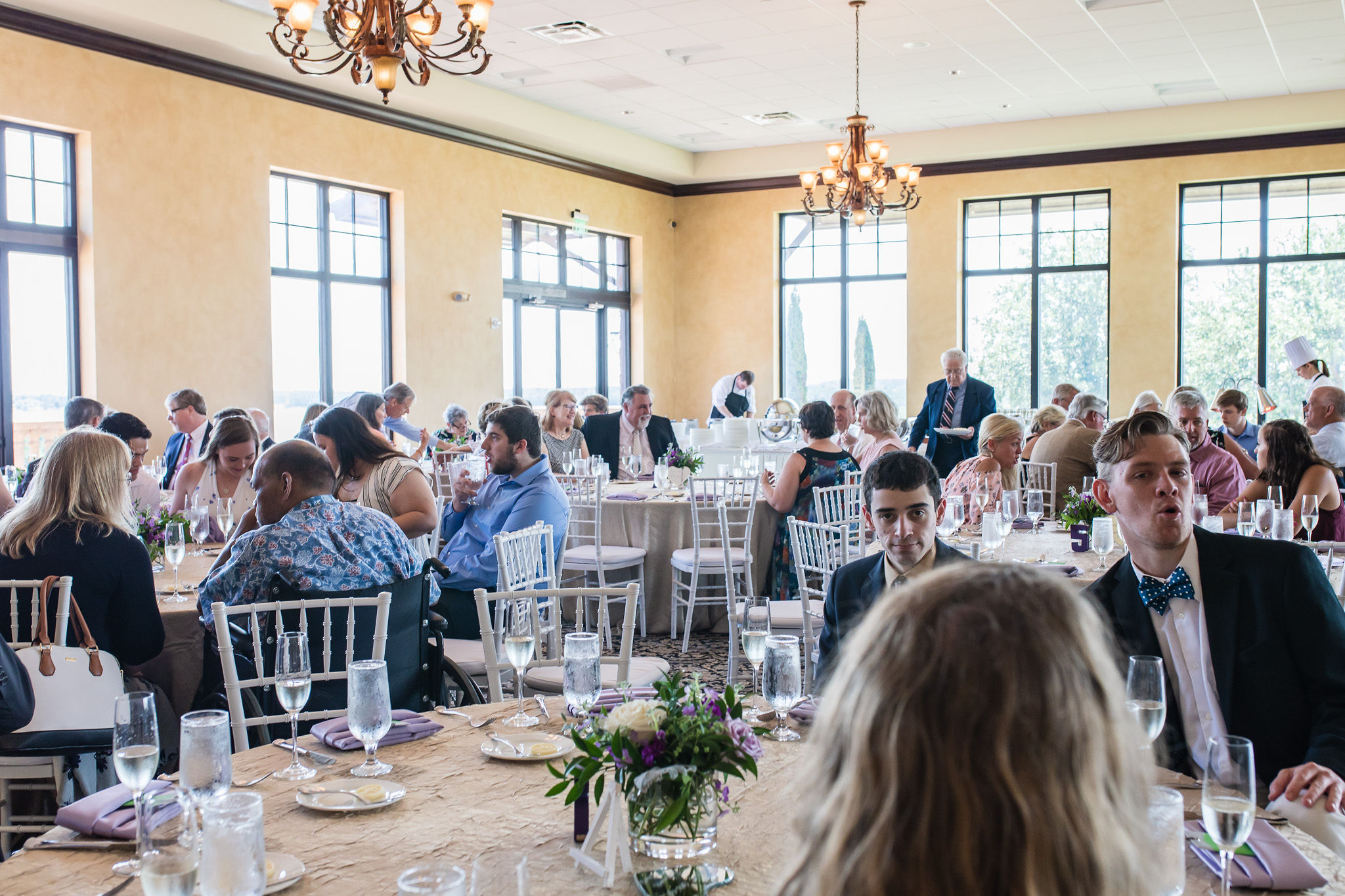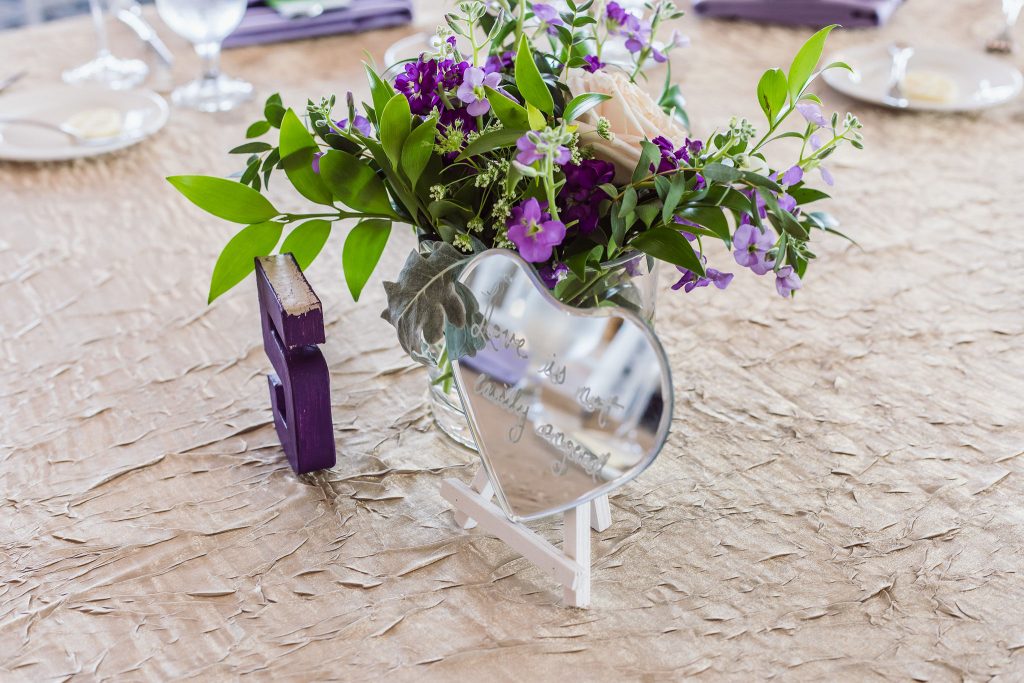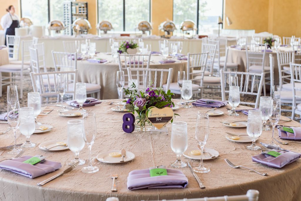 Guests then made their way to Bella Collina, where cocktail hour was set up. They signed the fun guestbook, which entailed leaving a colored thumbprint on a tree. Meanwhile, inside the ballroom, the reception was prepared with a room full of purple and white details. Each table had a gold centerpiece with a line from the “Love is Patient, Love is Kind” verse, as well as floral decor from Lavender and Lace. At the back of the room was the dessert table, holding a tower of donuts as an alternative wedding cake. We thought this was the perfect choice for a daytime brunch wedding!
