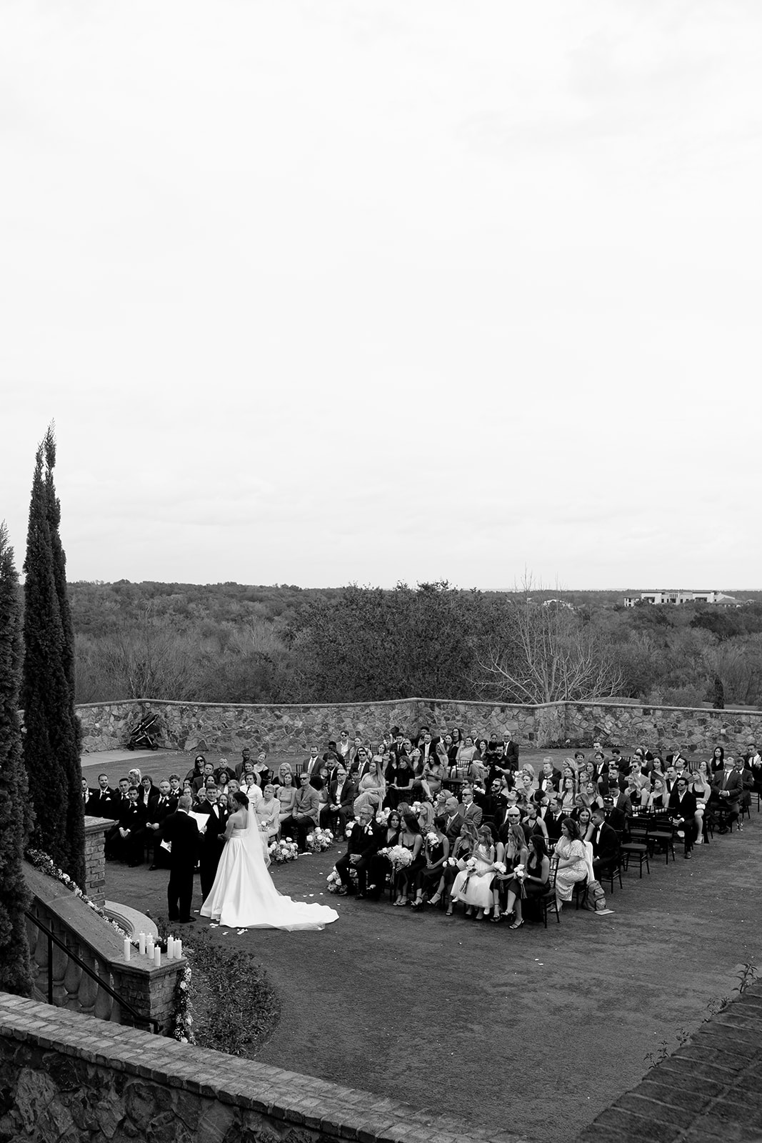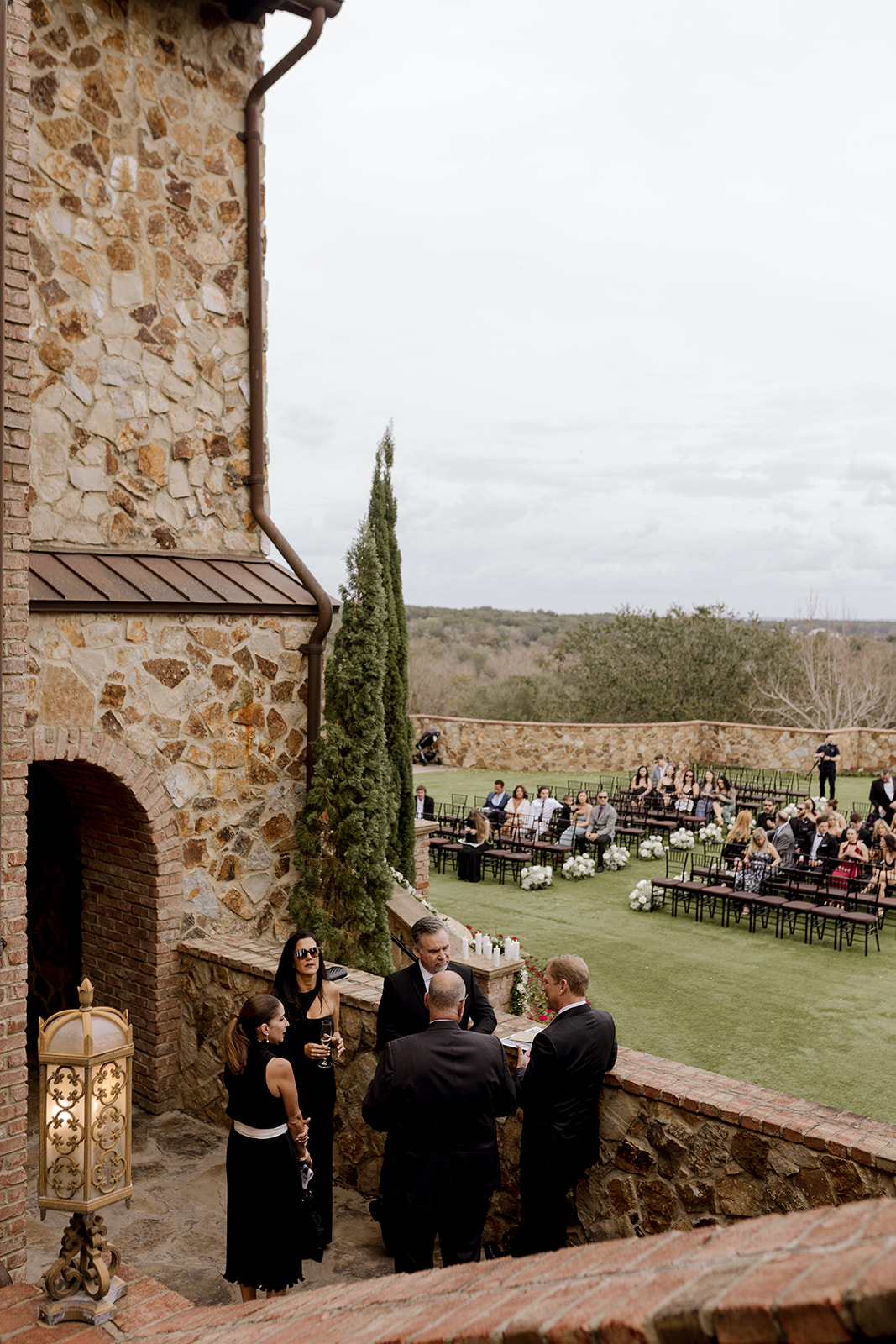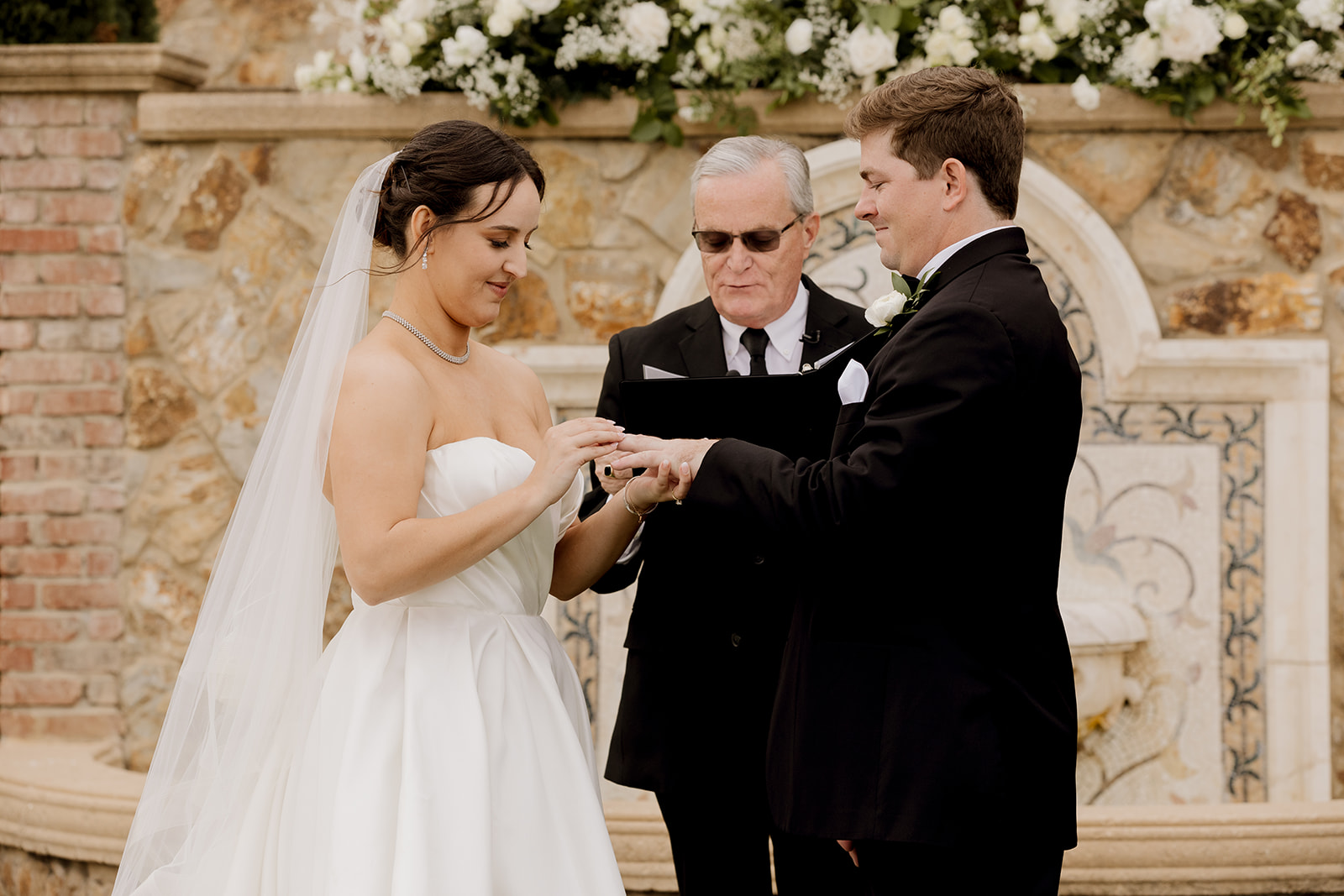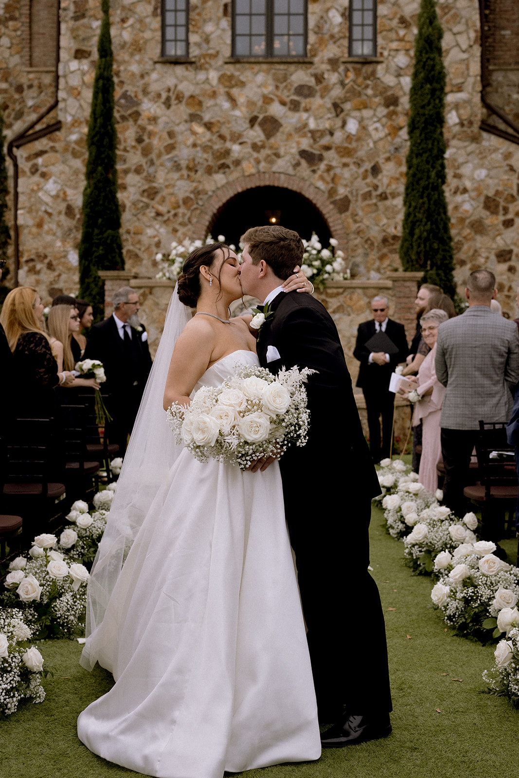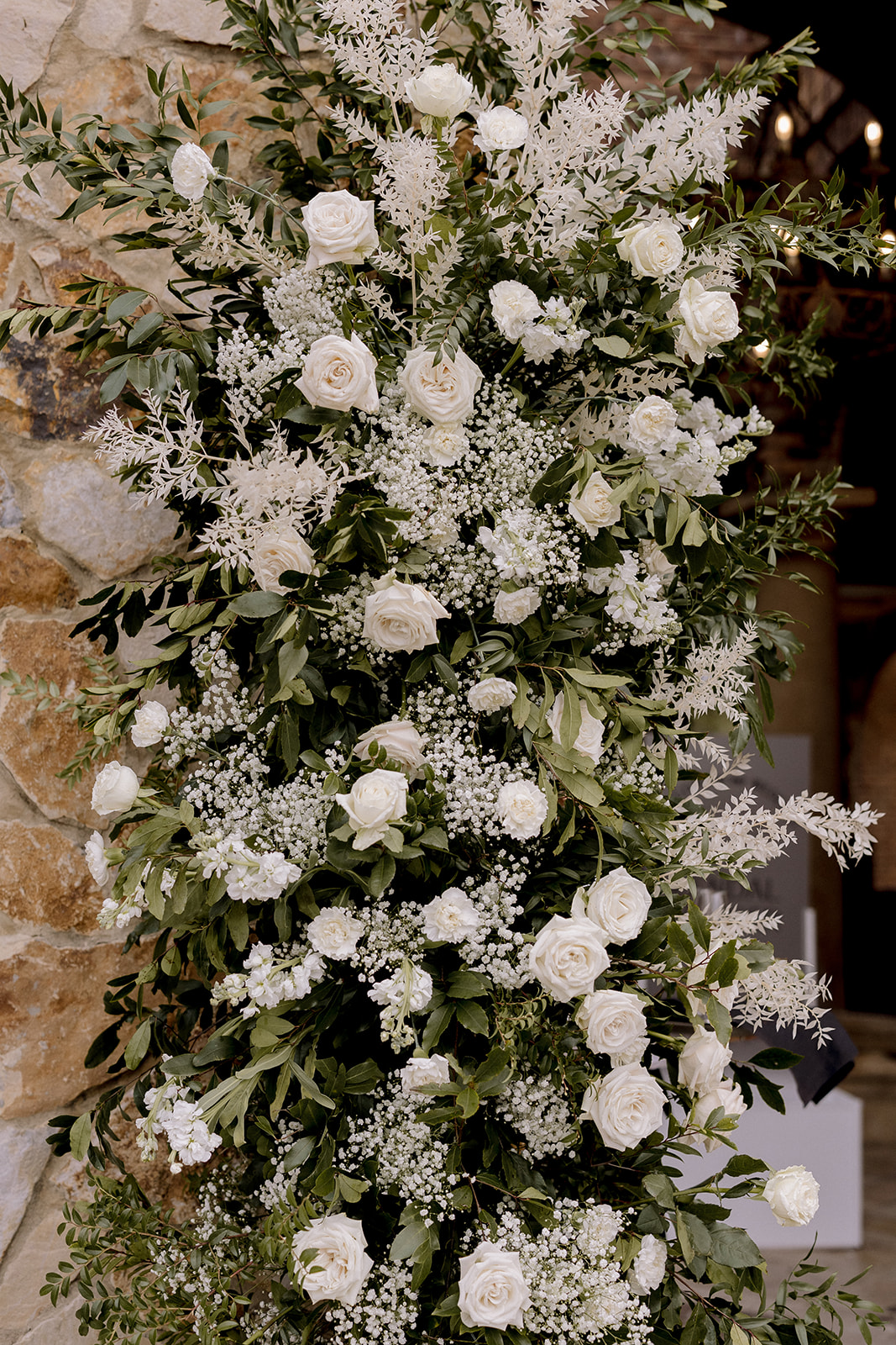 The ceremony took place overlooking the estate’s Tuscan-inspired grounds, where the couple exchanged vows framed by clouds of white blooms. Baby’s breath cascaded from the aisle arrangements, and every detail echoed the purity and grace of their love story.