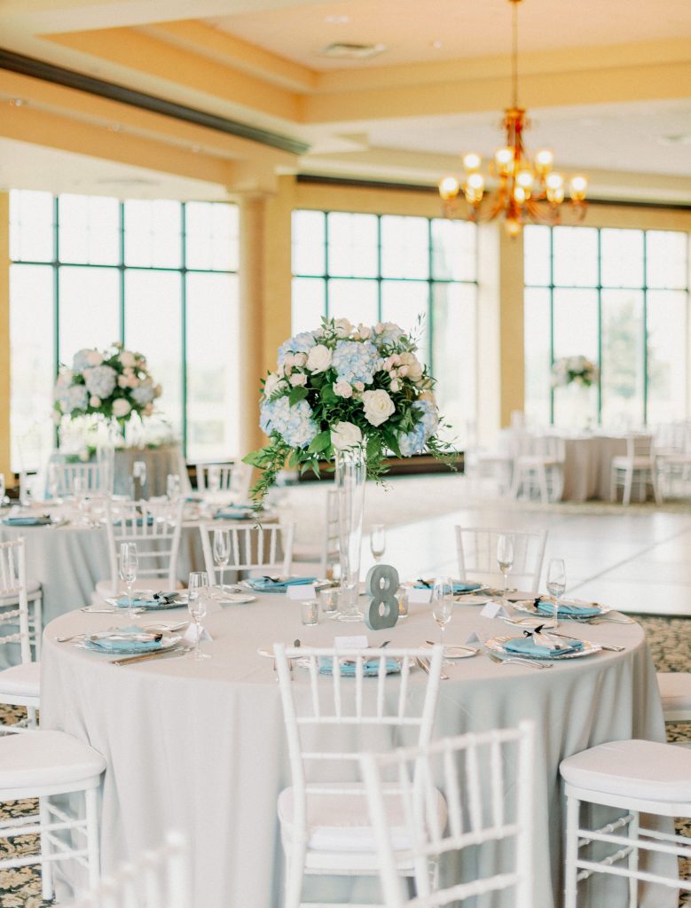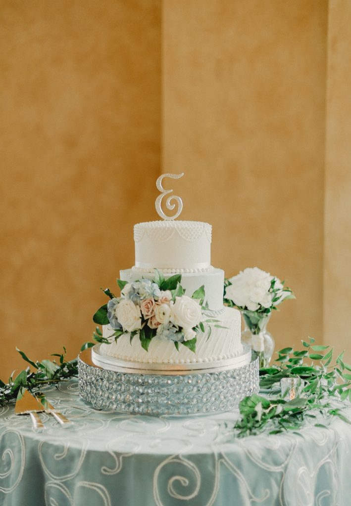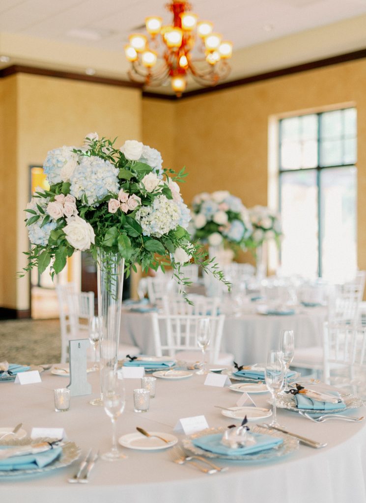 As guests enjoyed cocktail hour, the ballroom was prepared in pale blue and white. We loved the addition of beautiful patterned linens on the sweetheart and cake tables from Over the Top. Each table held a blooming floral centerpiece from Northside Florist, and each place held a “bride and groom” treat as a favor. Beside the sweetheart table stood the beautiful adorned wedding cake, baked by Publix Bakery. Just outside was the gold-bordered seating chart, as well as the personalized photo guestbook.