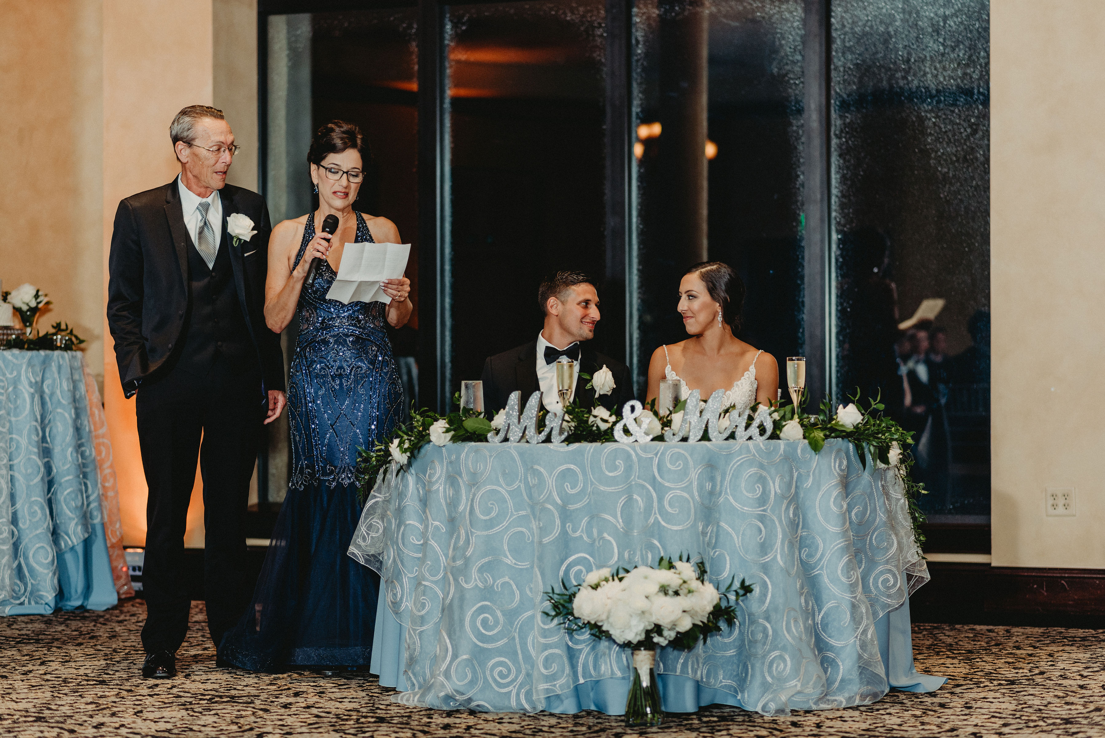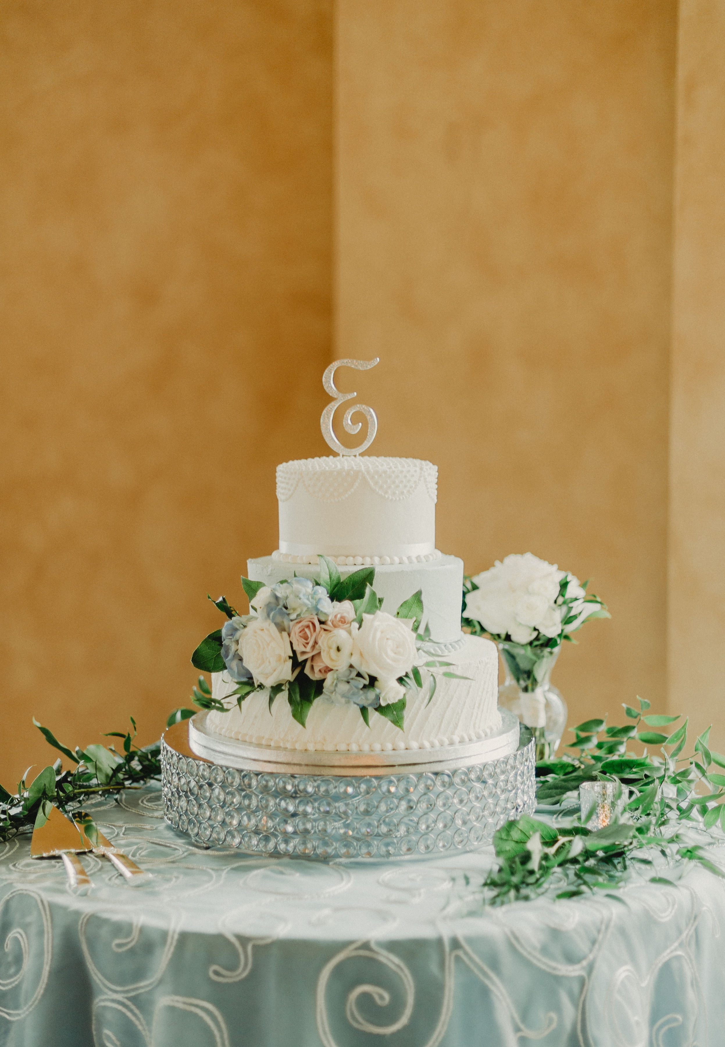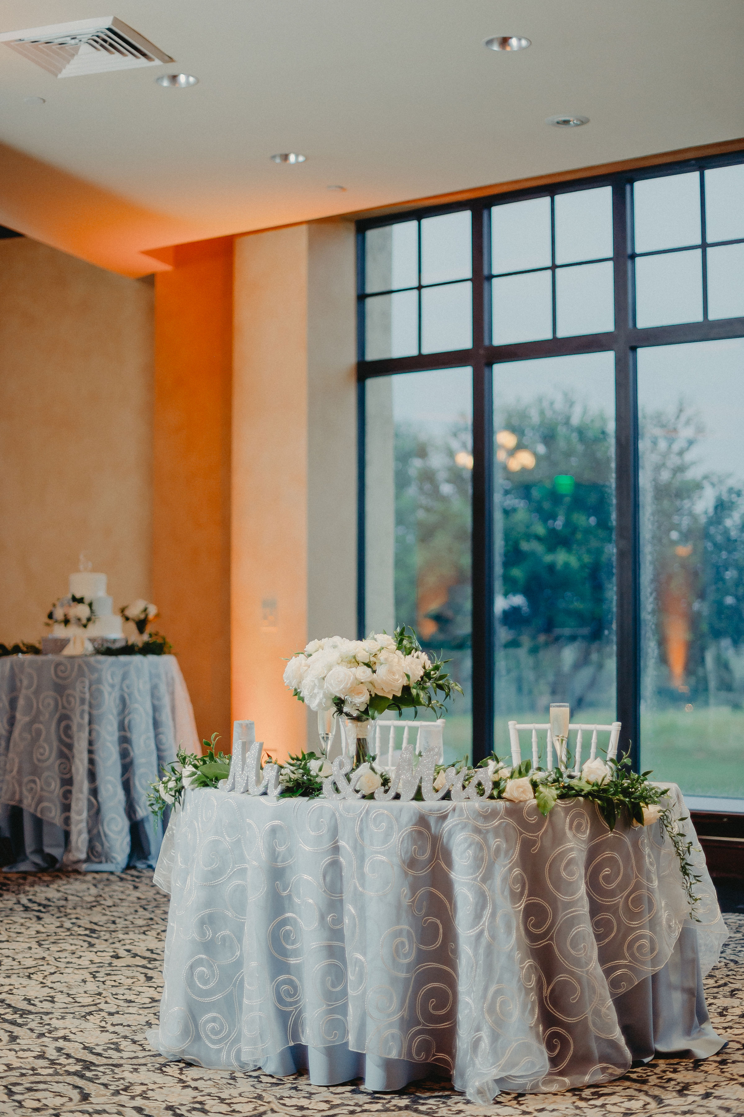 As guests enjoyed cocktail hour, the ballroom was prepared in pale blue and white. We loved the addition of beautiful patterned linens on the sweetheart and cake tables from Over the Top. Each table held a blooming floral centerpiece from Northside Florist, and each place held a “bride and groom” treat as a favor. Beside the sweetheart table stood the beautiful adorned wedding cake, baked by Publix Bakery. Just outside was the gold-bordered seating chart, as well as the personalized photo guestbook.
