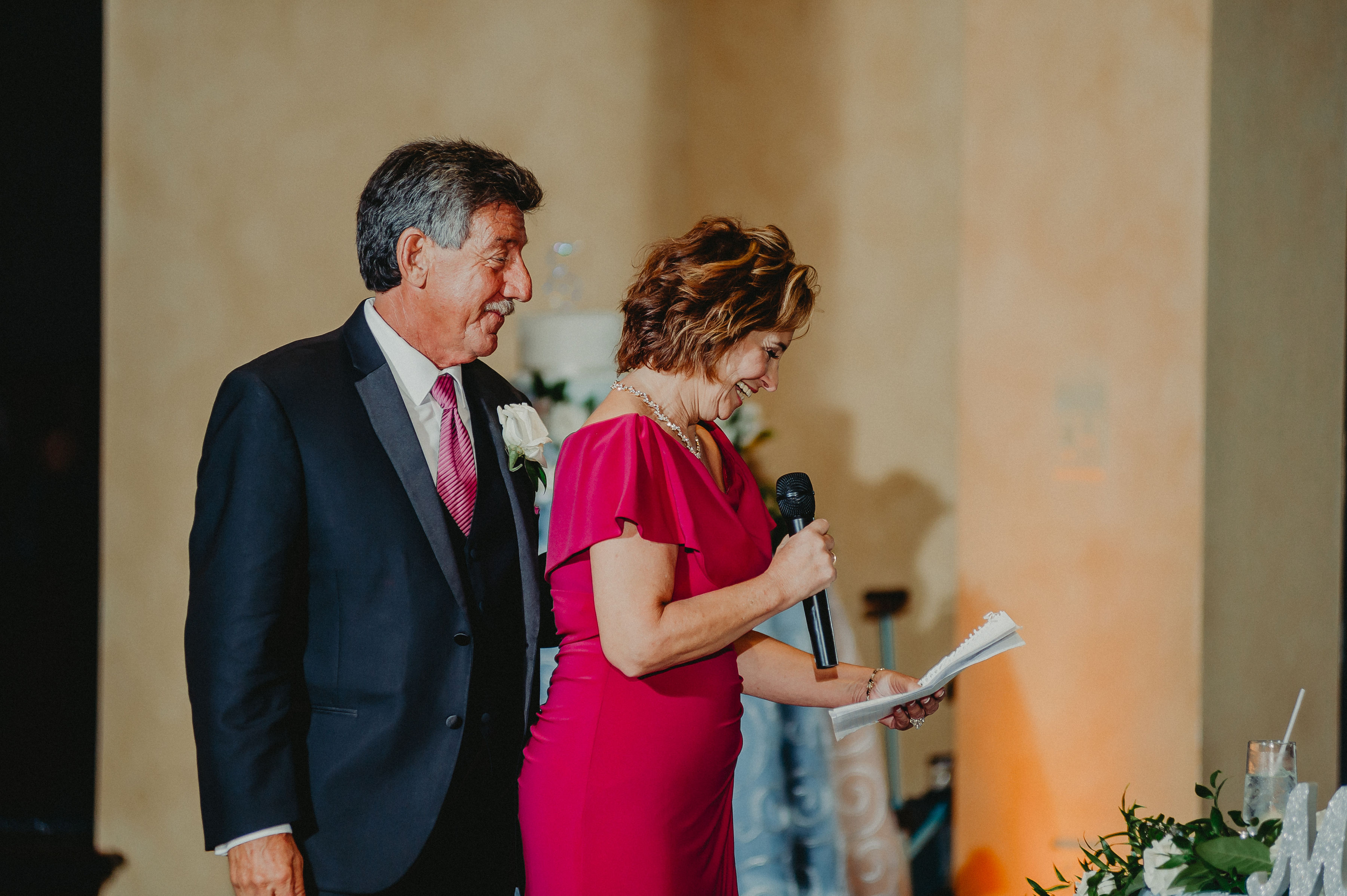 The reception began with the introduction of the newlyweds, followed by their fun first dance. As salads were served, Taylor and Cody heard toasts from their parents and friends. Dinner was then served, catered by Bella Collina. After enjoying their meals, Taylor shared a dance with her father, and Cody shared a dance with his mother.