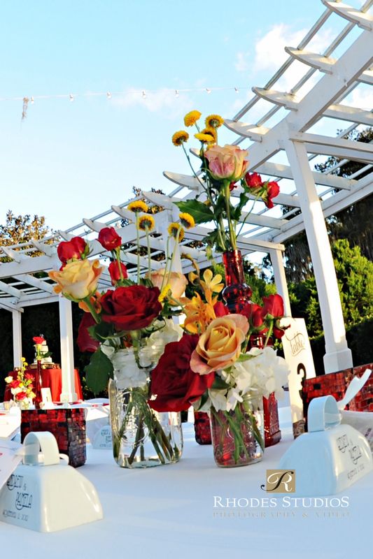 The reception was just as beautiful, with lots of personal touches thanks to Pamela’s love for all things Etsy! Lee Forrest Designs created whimsical red and yellow centerpieces in mix-n-match bottles and vases, and Rhodes Studios captured all the fun and beauty of the wedding in their photographs. Soundwave Entertainment‘s DJ helped everyone dance off the calories they ate, thanks to the awesome candy station, the wedding cake by Party Flavors Custom Cakes and Big City Catering‘s delicious food! Pamela and Andrew’s first dance was amazing, thanks to Two Left Feet dance studio. Everyone had a great time, even after the unexpected rainstorm that drove everyone inside temporarily!