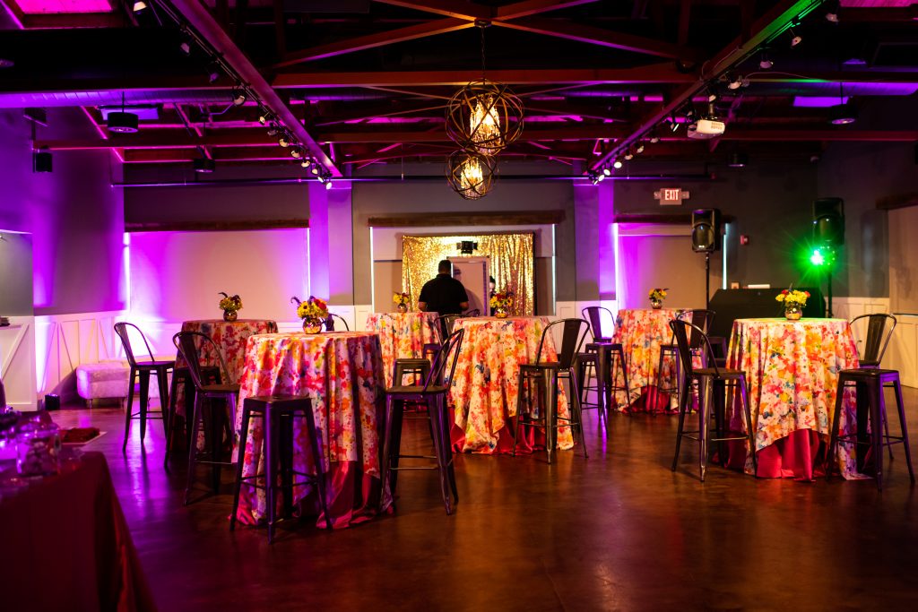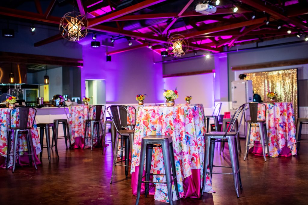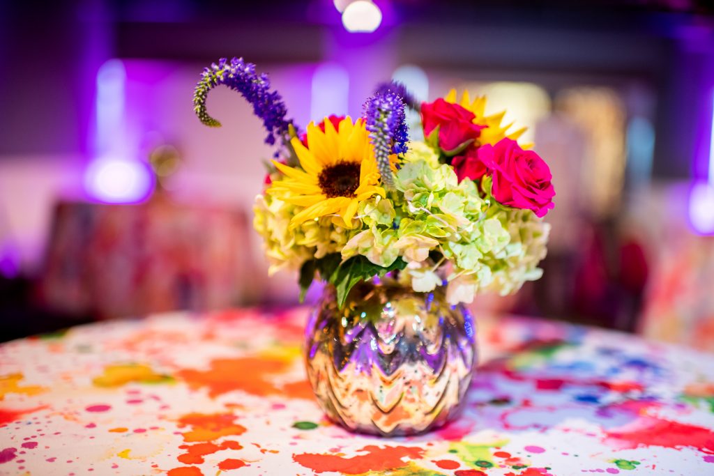 The tables, meanwhile, were covered with super cool dropcloth linens from Over the Top Linens. As Zoya is an artist, we felt it would be a perfect match! We loved how the colors on the linens paired with the colorful floral centerpieces, arranged by Flowers by Lesley.