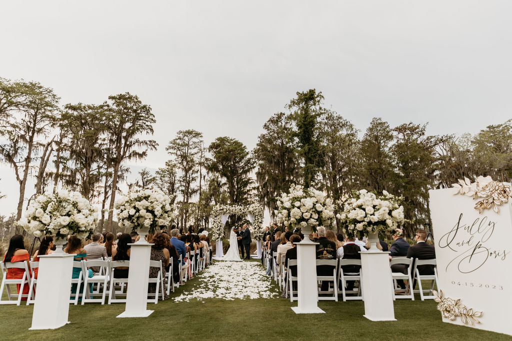 As they were taking pictures around the property our vendor team put the final touches on their luxury country club wedding ceremony with stunning white and green floral arrangements, a white petal aisle, a breathtaking welcome sign, and a lake front view that brought it all together.