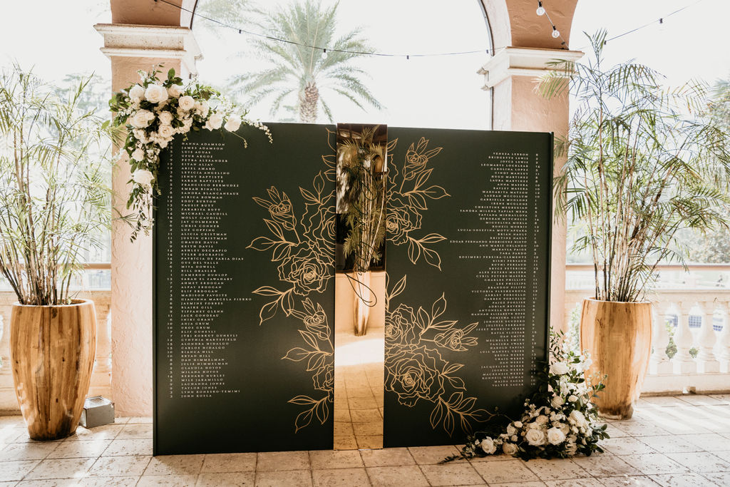 After our couple was pronounced the new Mr. and Mrs. their guests moved to the patio of the country club overlooking the ceremony location and lake for cocktail hour. Guests enjoyed taking pictures with the elegant touch of entertainment found in live statues and then moved to find their table numbers on the stunning seating chart display!
