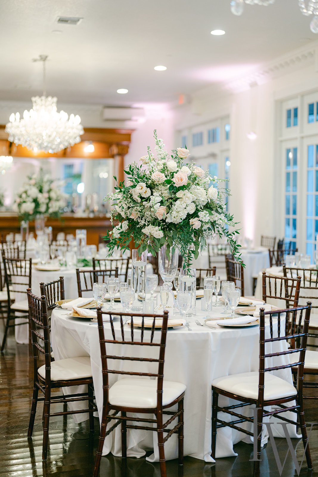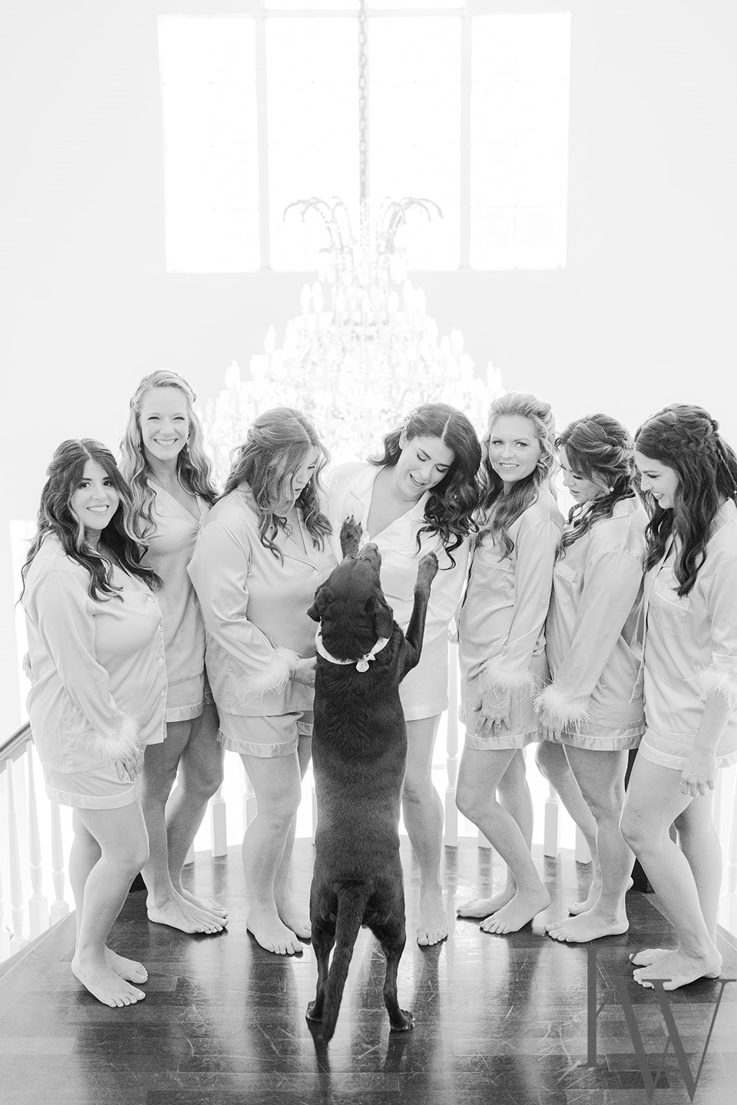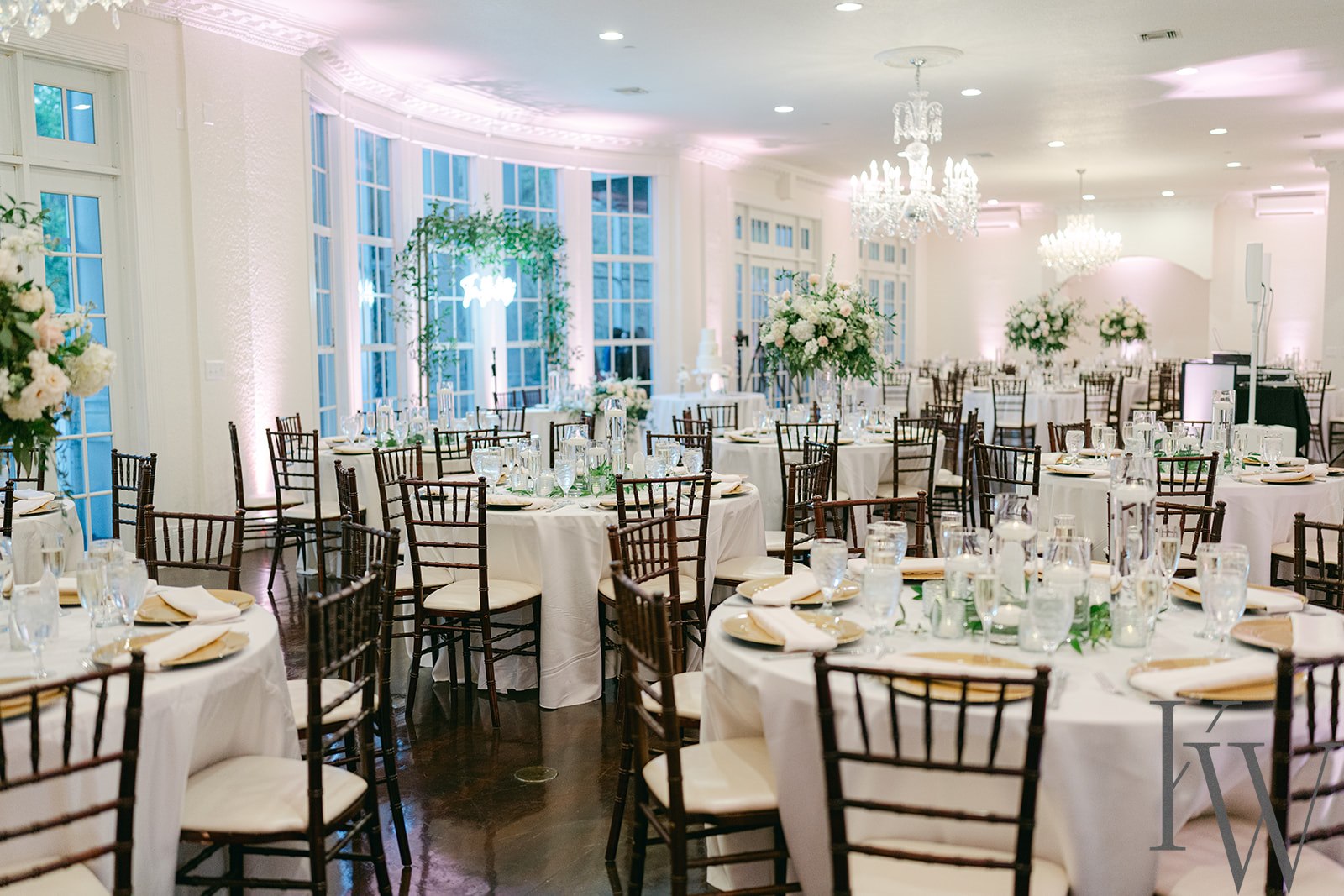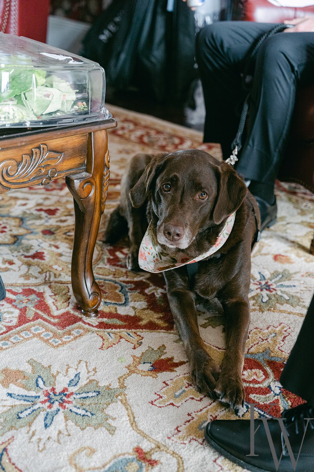 Guests enjoyed a lively cocktail hour on the back patio, sipping champagne while Kona made her rounds for cuddles and photos. Later, the celebration moved into the ballroom, glowing with candlelight, gold accents, and more of the blush blooms that defined the day.