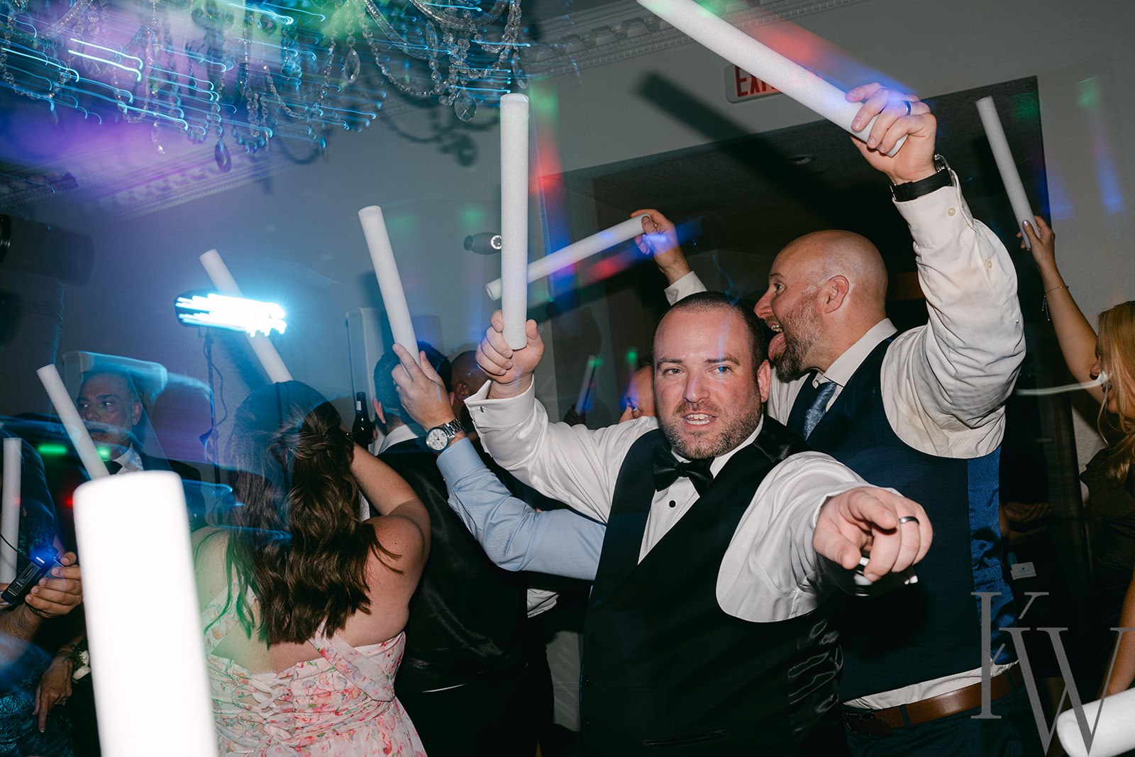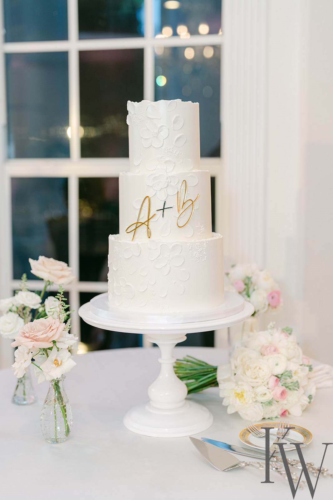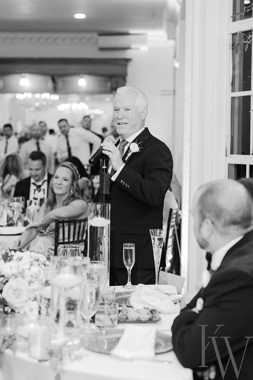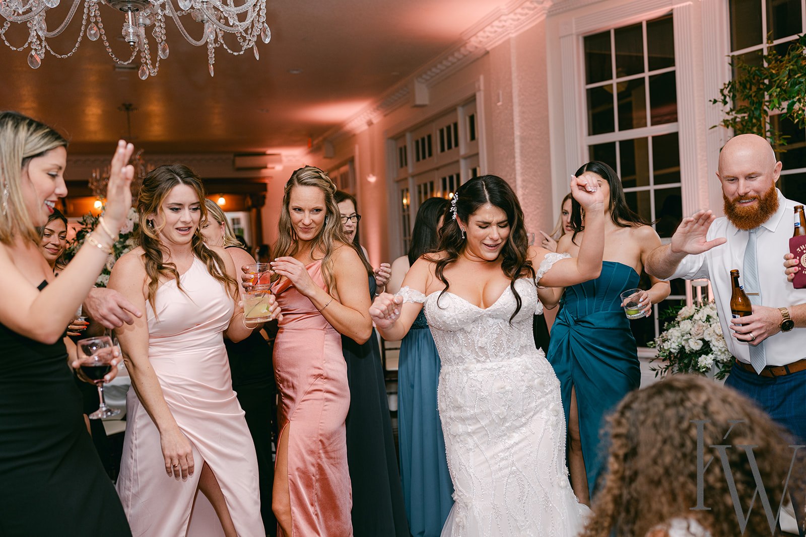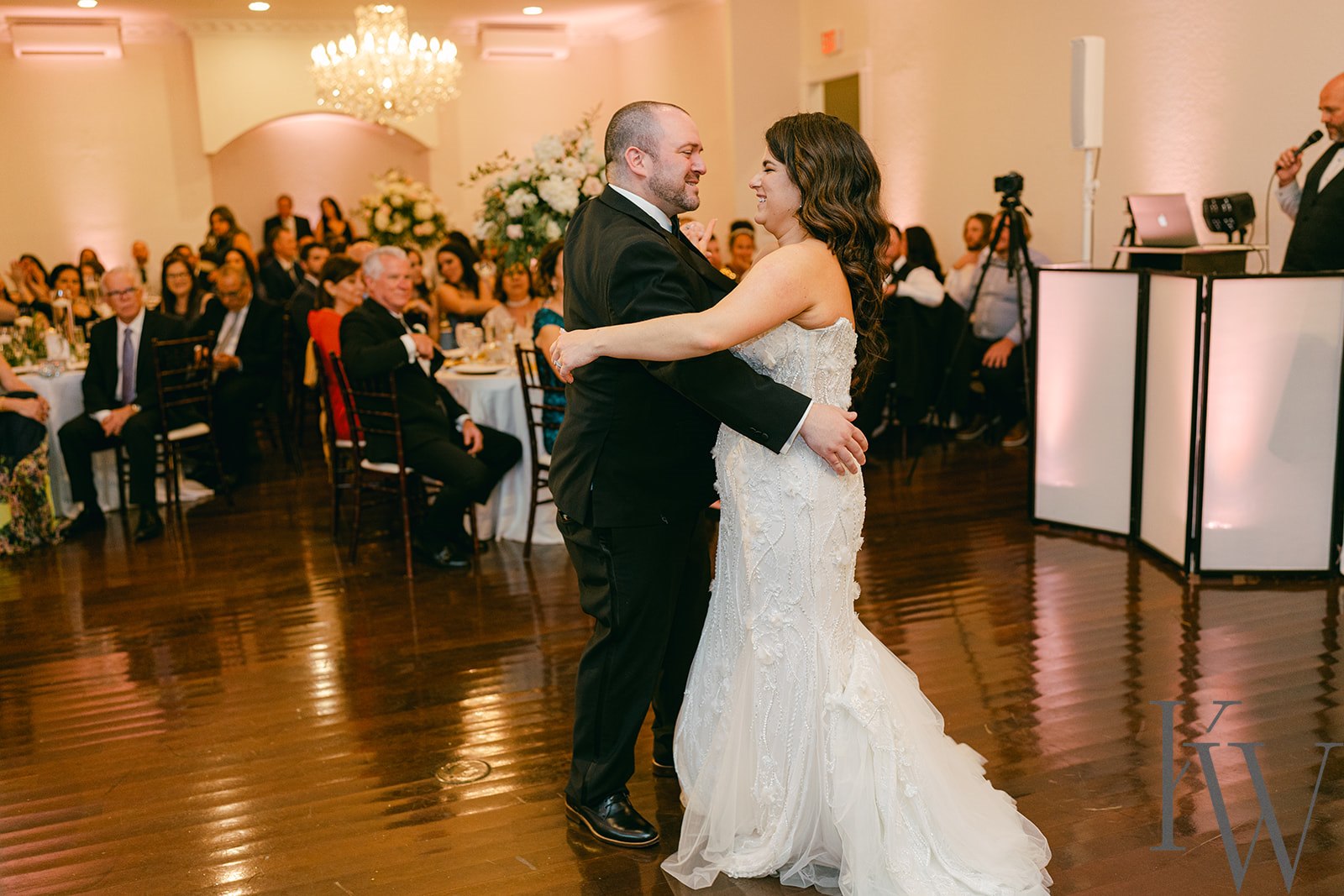 Guests enjoyed a lively cocktail hour on the back patio, sipping champagne while Kona made her rounds for cuddles and photos. Later, the celebration moved into the ballroom, glowing with candlelight, gold accents, and more of the blush blooms that defined the day.