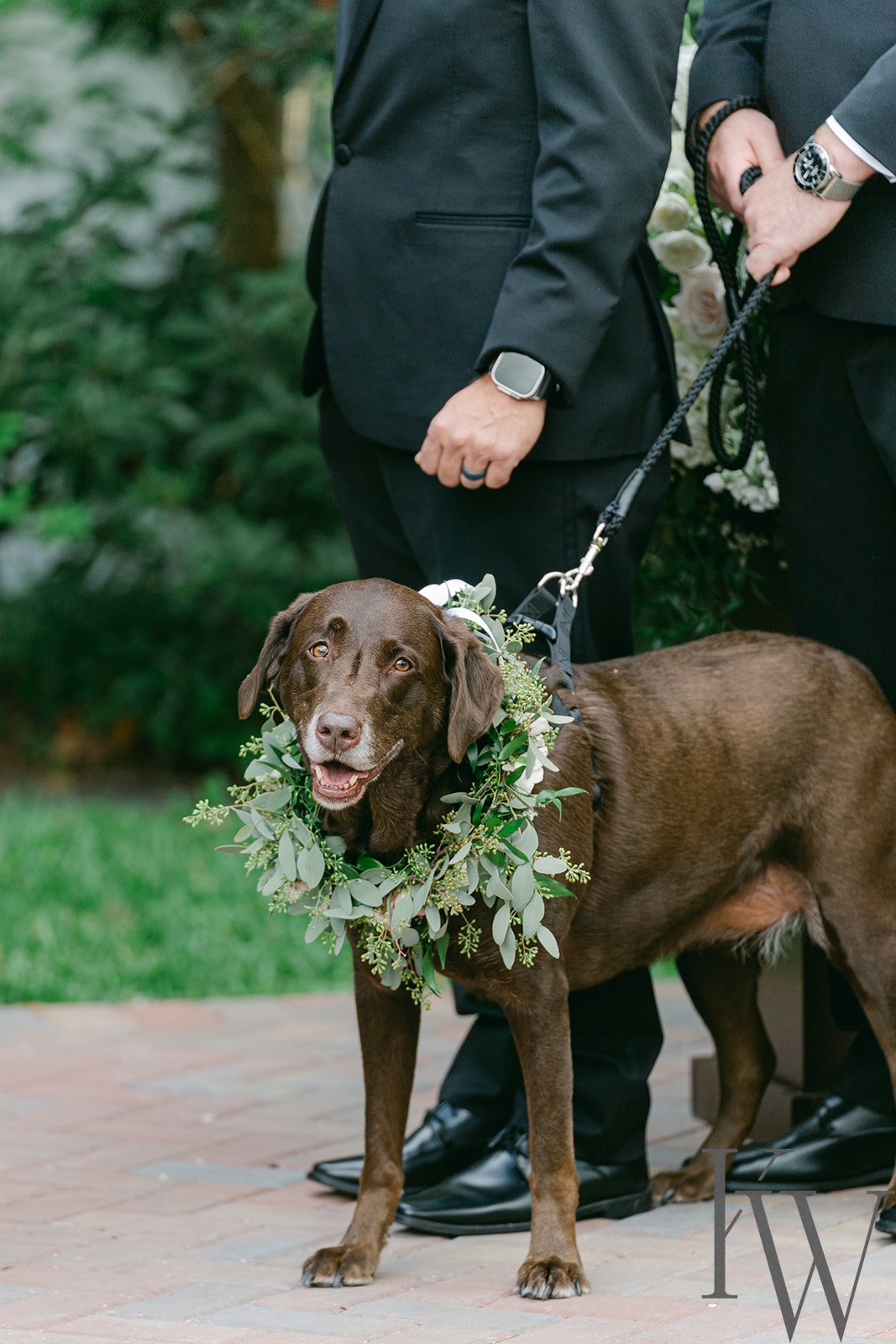 The couple chose a romantic outdoor ceremony in the Jesup Garden, where blush and ivory blooms framed the altar beneath the estate’s towering oaks. But what truly stole the show was Kona, proudly walking down the aisle with a floral collar to match the wedding’s soft garden palette. She stood by Alex and Billy during their vows, calm and loyal—clearly knowing the importance of the moment.