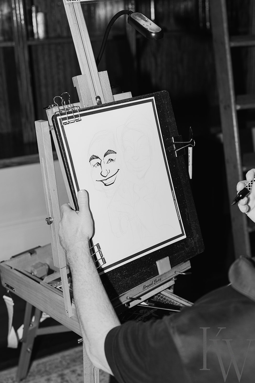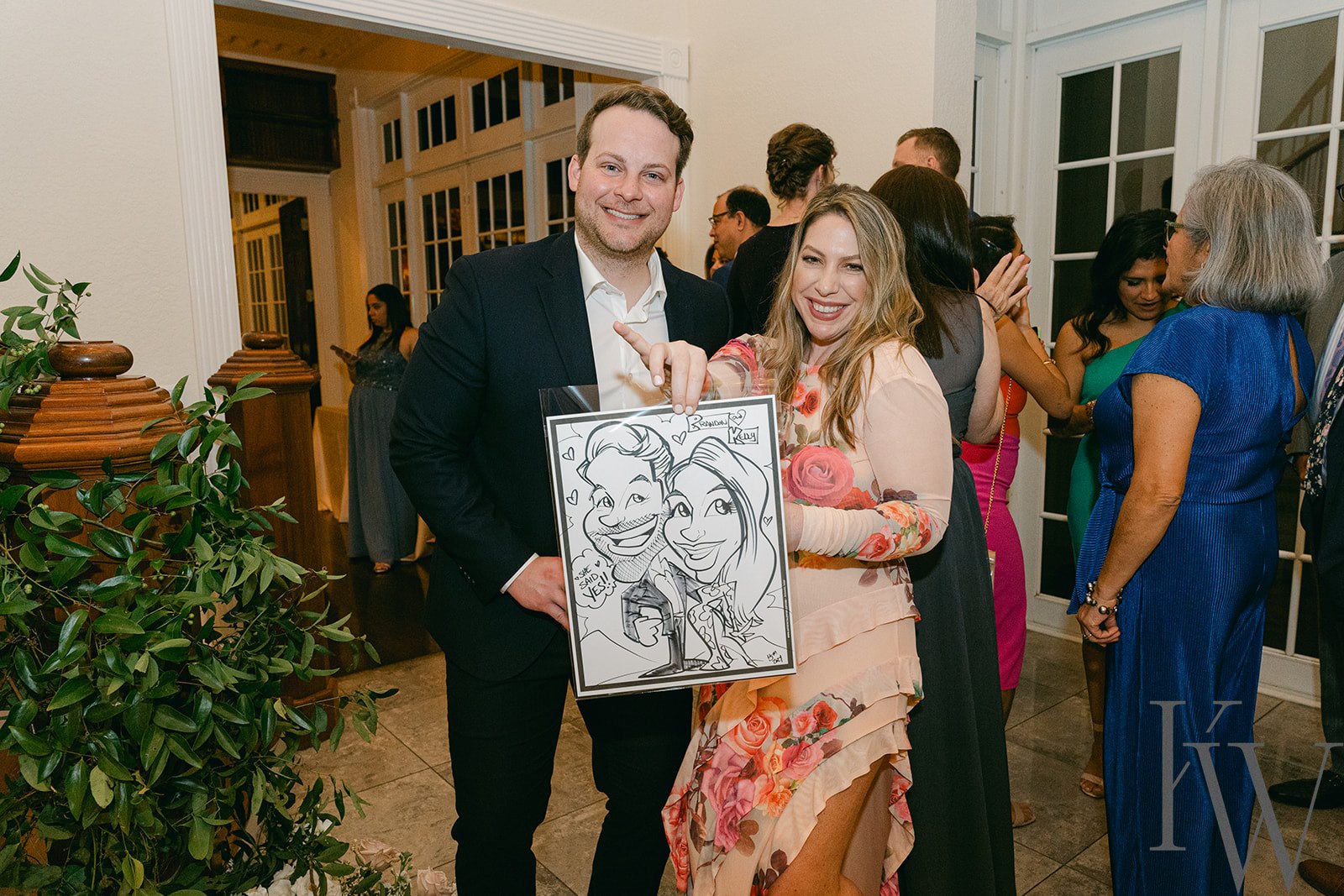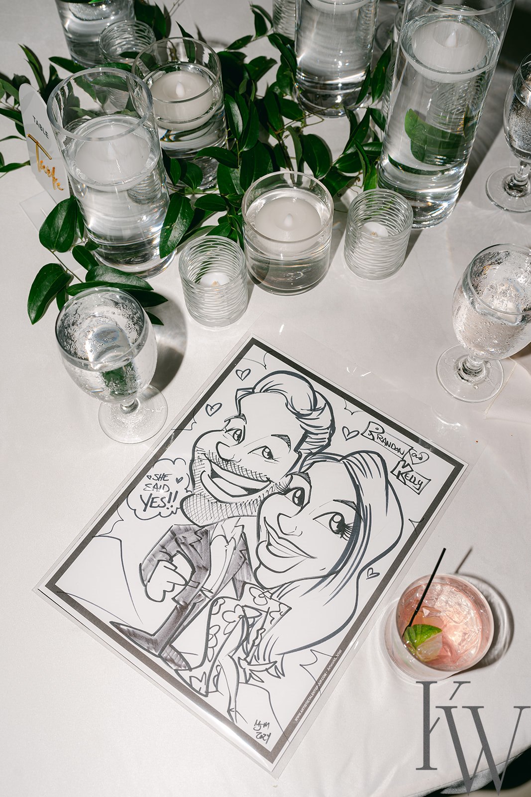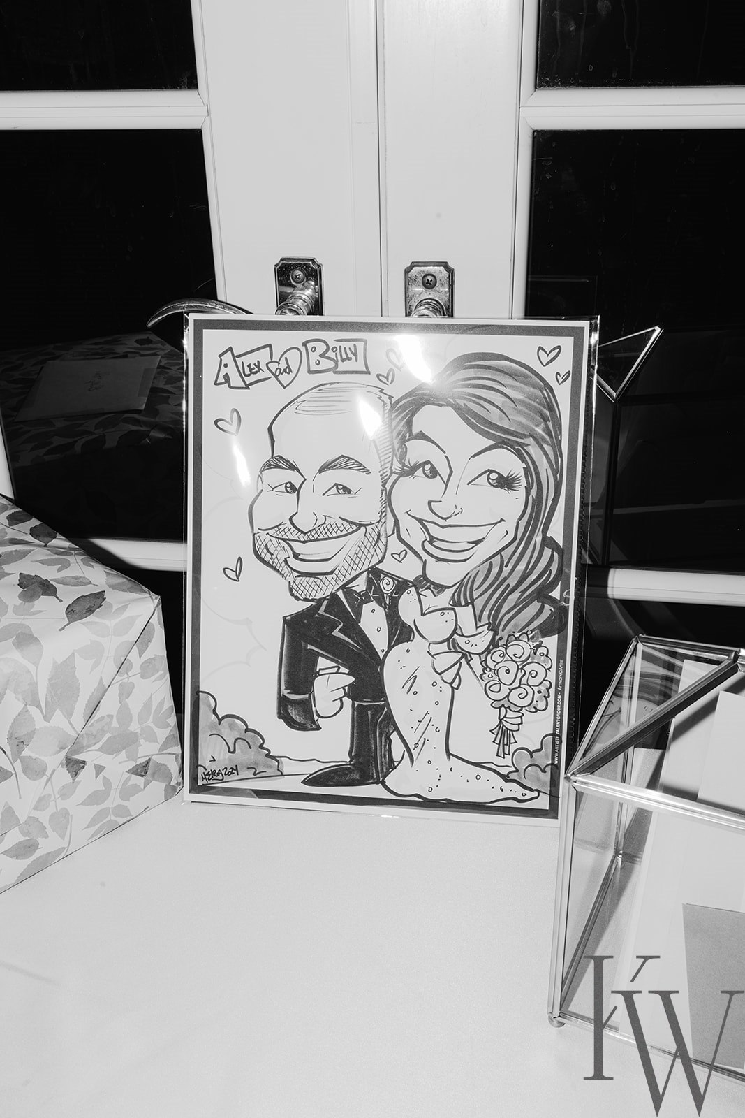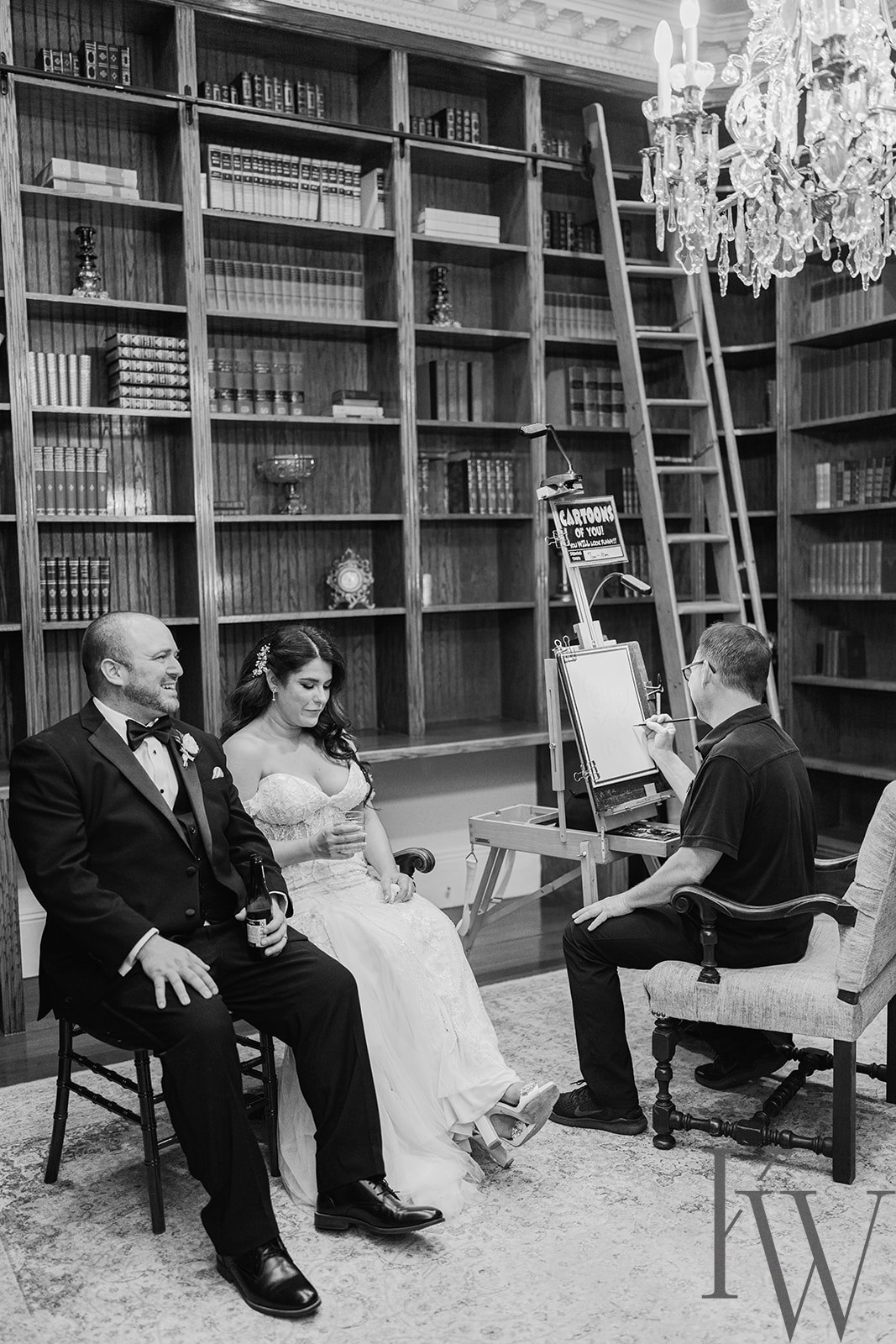 After our couple shared their sweet first dance and some touching toasts with their guests, they all shared a delicious meal followed by cake. But that was just the beginning of a night full of a packed dance floor and a full library where you could find a line for their talented caricature artist providing portraits for guests!