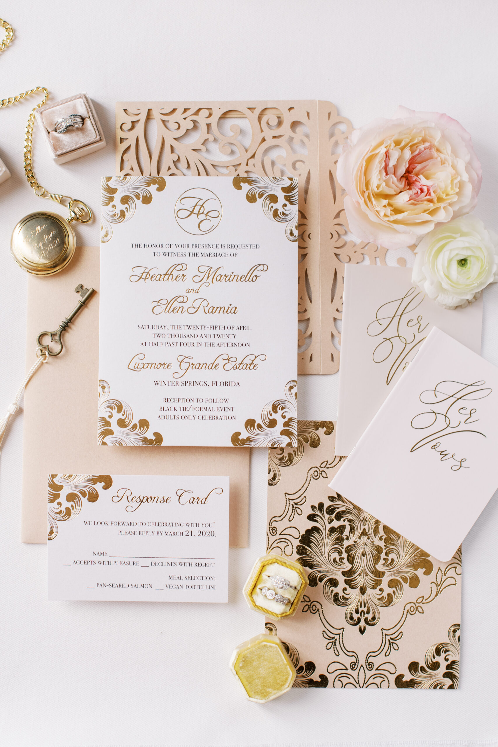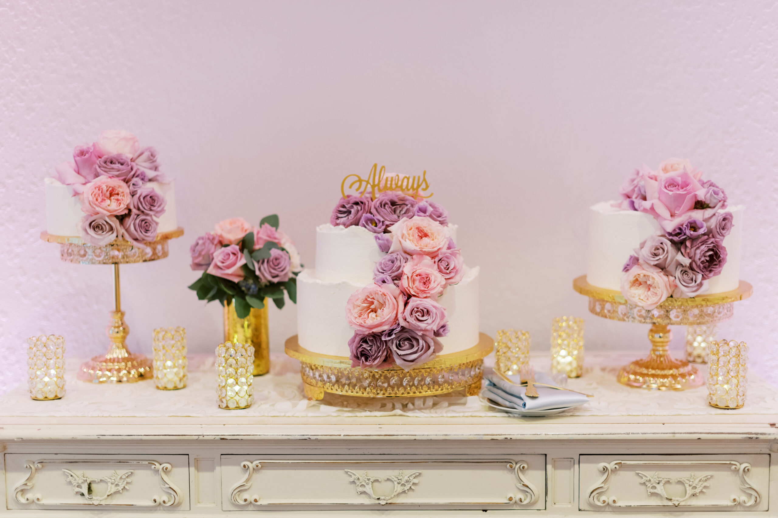 Their fairytale wedding continued through with an even more stunning display in the reception down to the smallest details. The beautiful details brought everything together with rented gold chairs, bowtie folded napkins, textured tablecloth overlays, a fun multiple cake display, and amazing floral displays!
