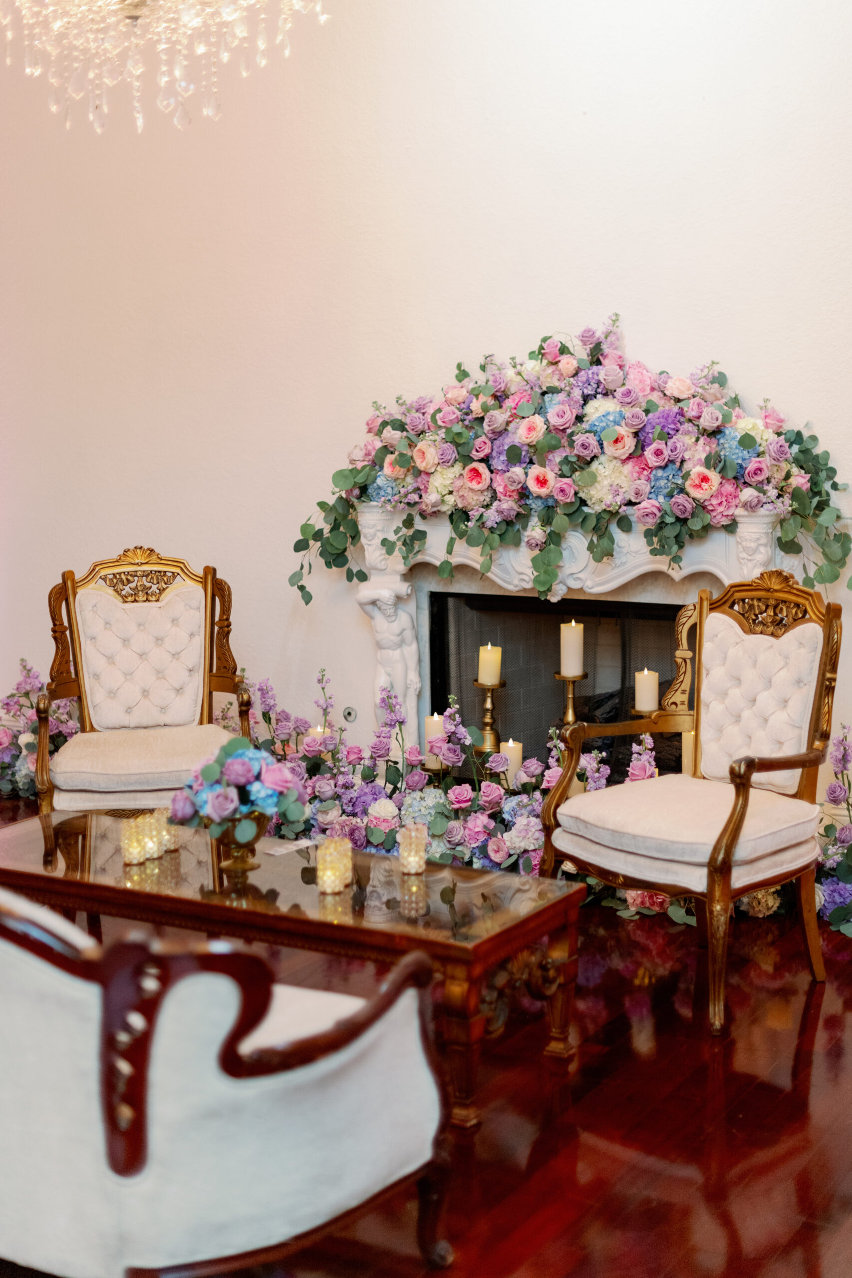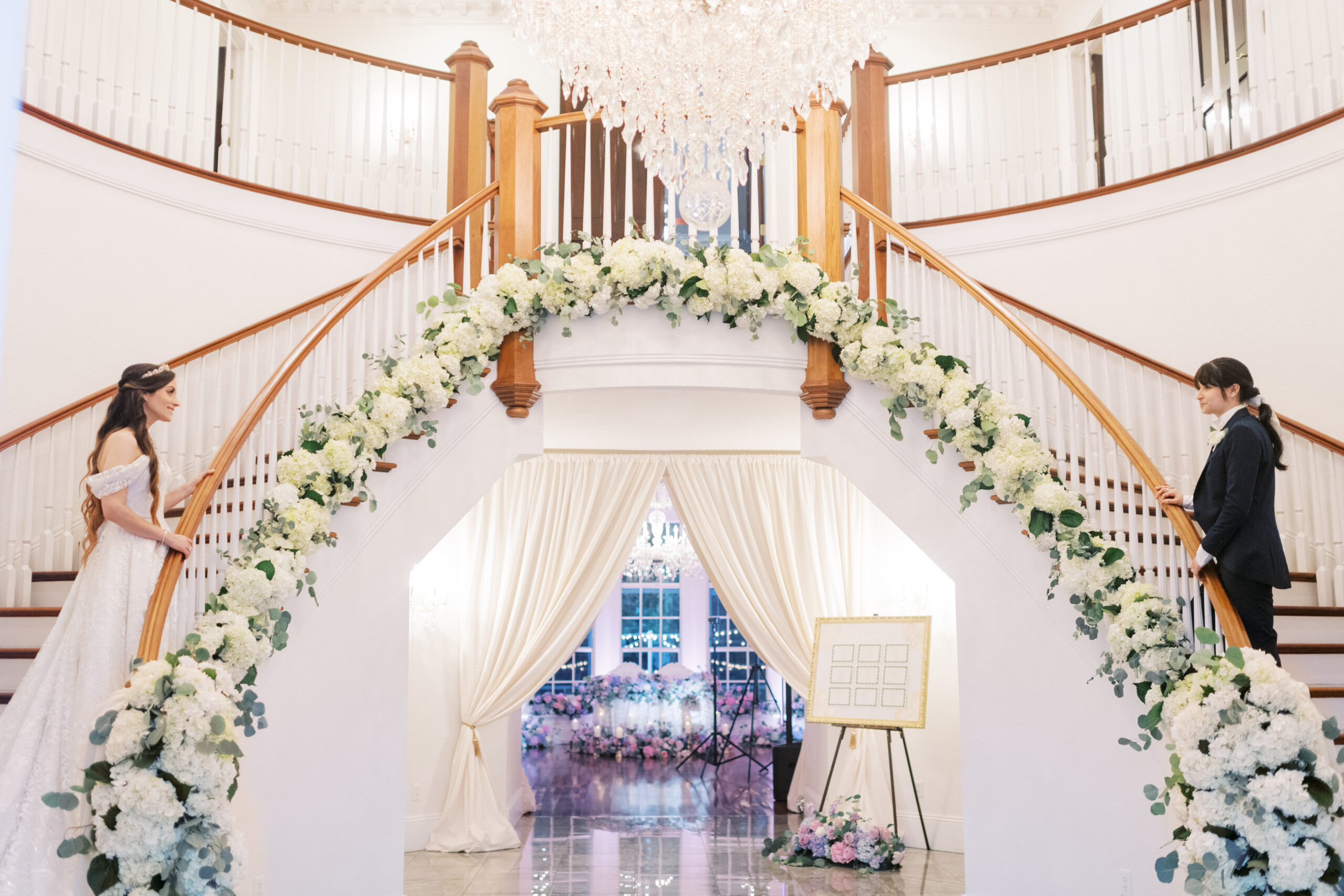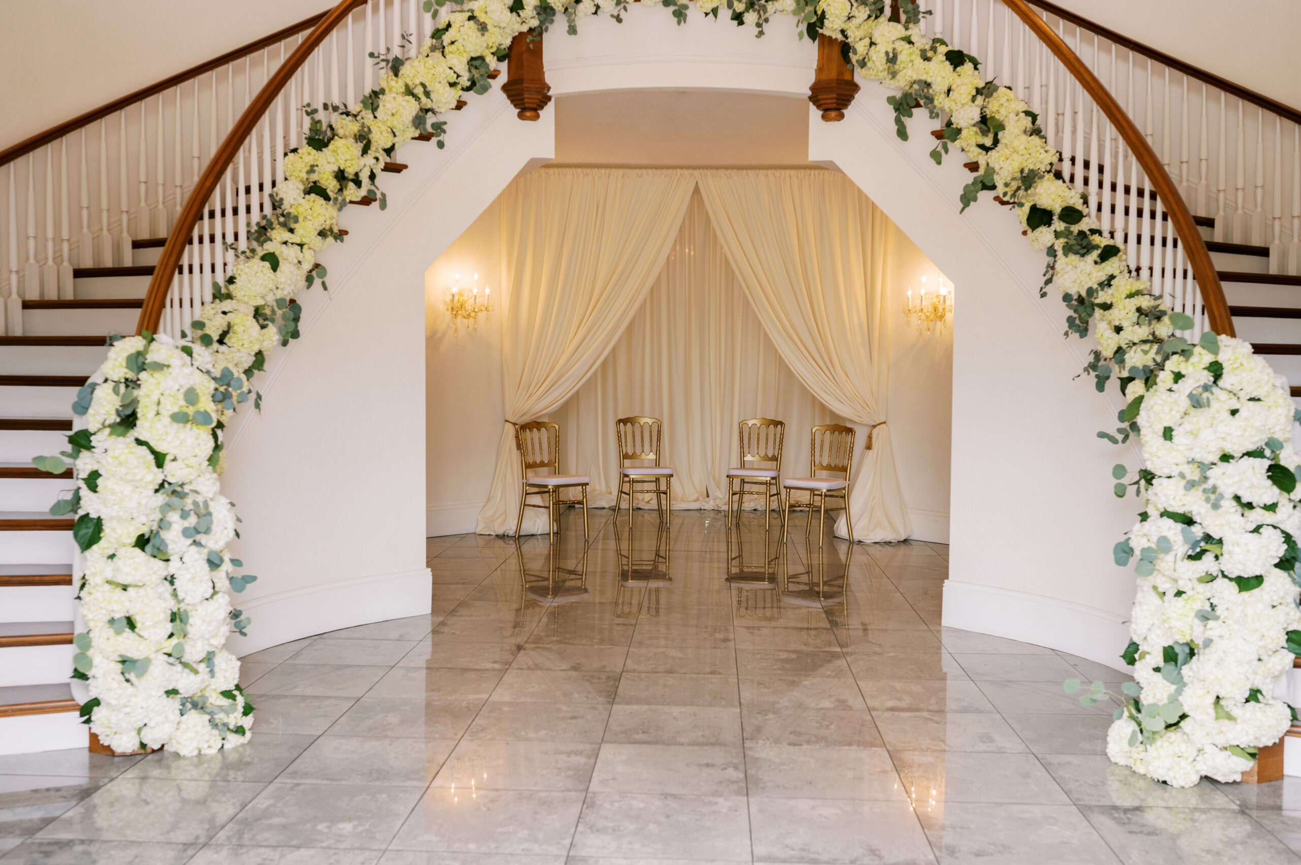 Our guests were welcomed by a sweet Harry Potter themed welcome sign a nod to the couple’s personality to then enter into the venue and see the lavishly decorated staircase with a string quartet. They then carried on to ceremony inside the estate room which was filled with beautiful fairytale-themed floral arrangements even surrounding the fireplace.
