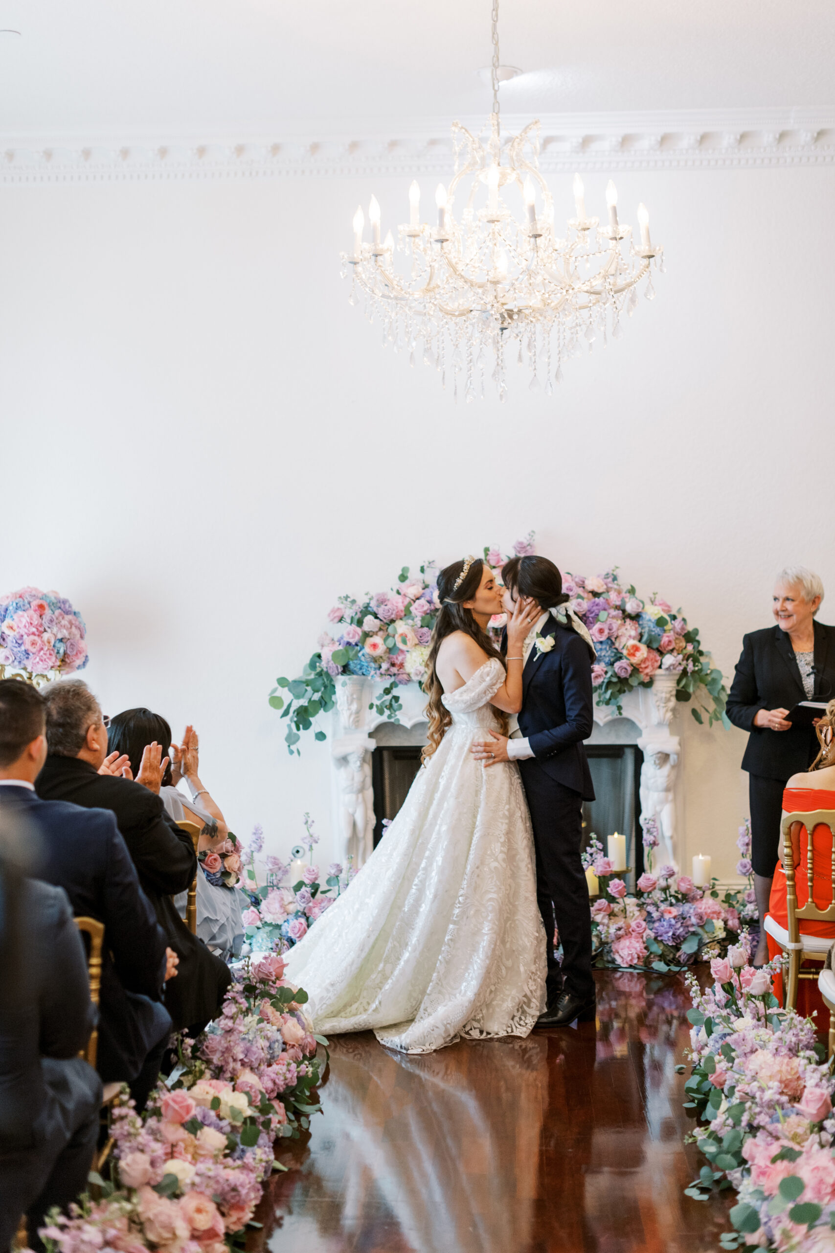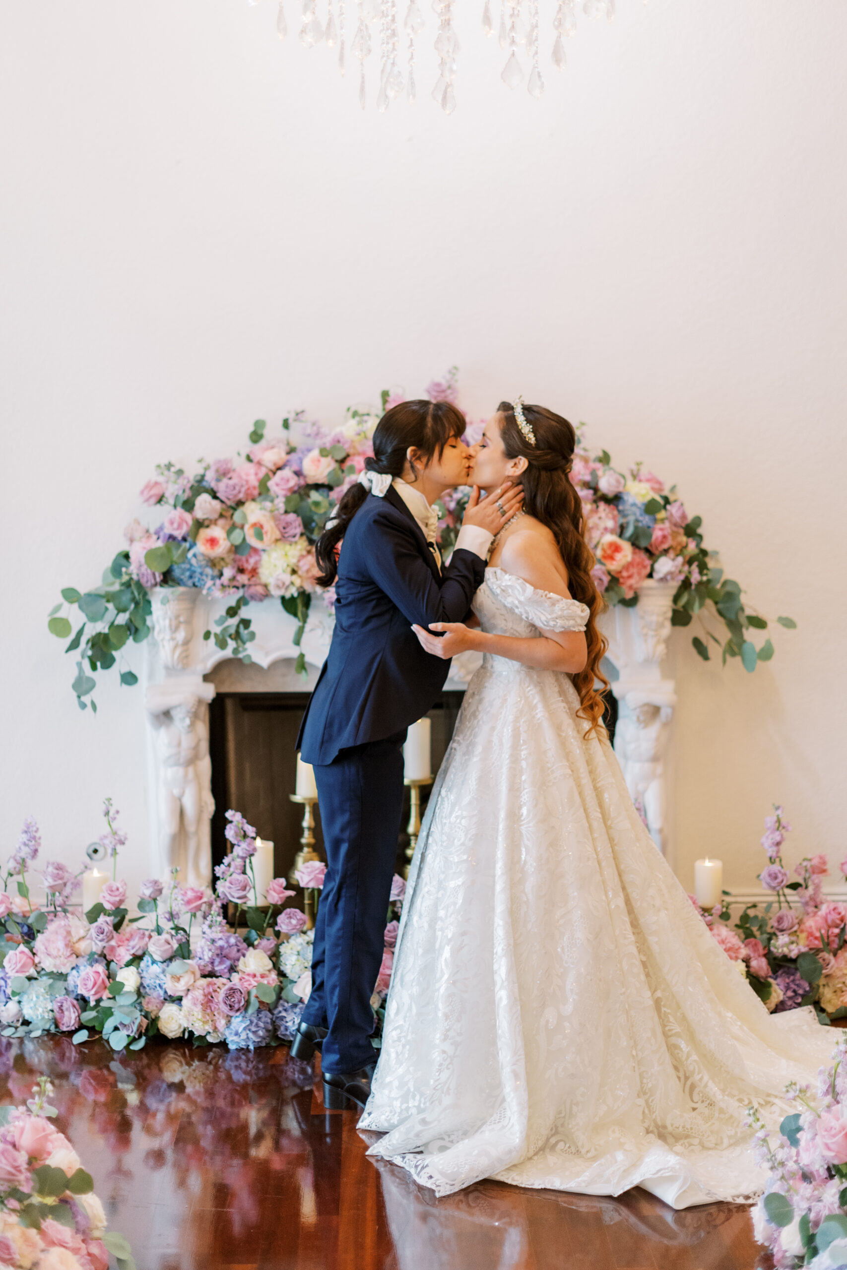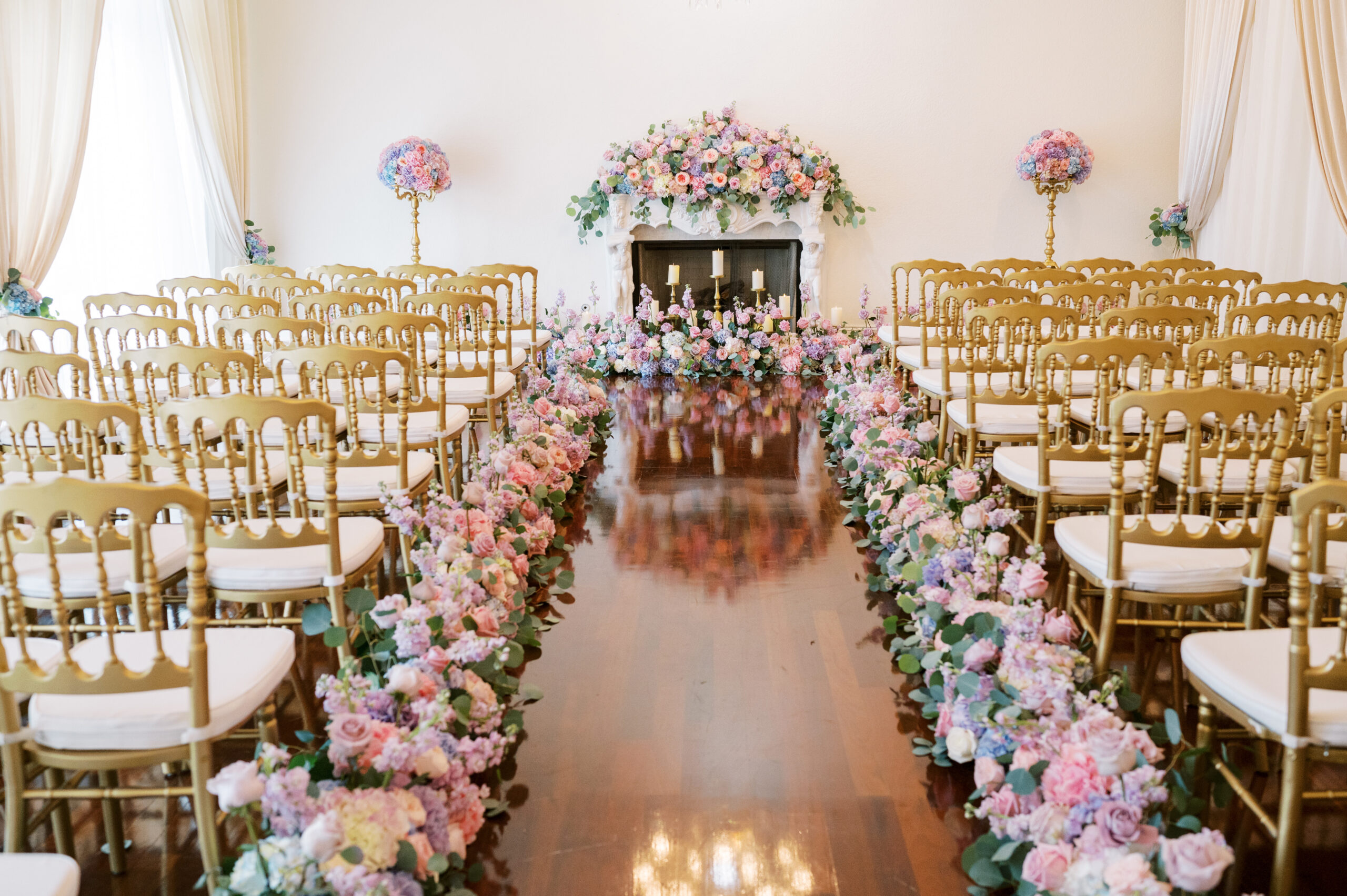 Our guests were welcomed by a sweet Harry Potter themed welcome sign a nod to the couple’s personality to then enter into the venue and see the lavishly decorated staircase with a string quartet. They then carried on to ceremony inside the estate room which was filled with beautiful fairytale-themed floral arrangements even surrounding the fireplace.