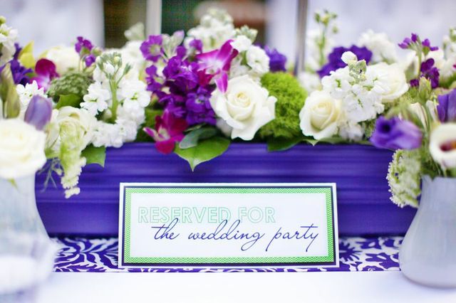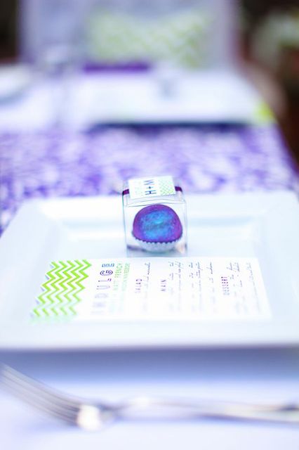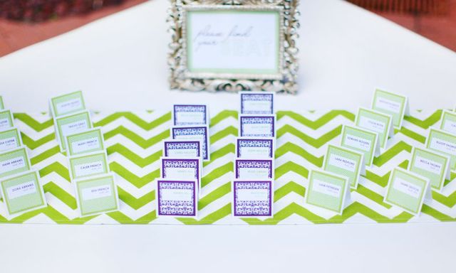 Dogwood Blossom Stationery & Invitation Studio, LLC provided the menus and purple and green patterned seating cards.