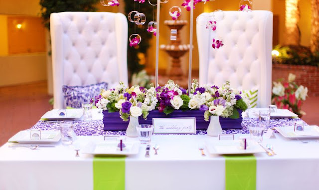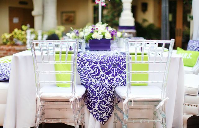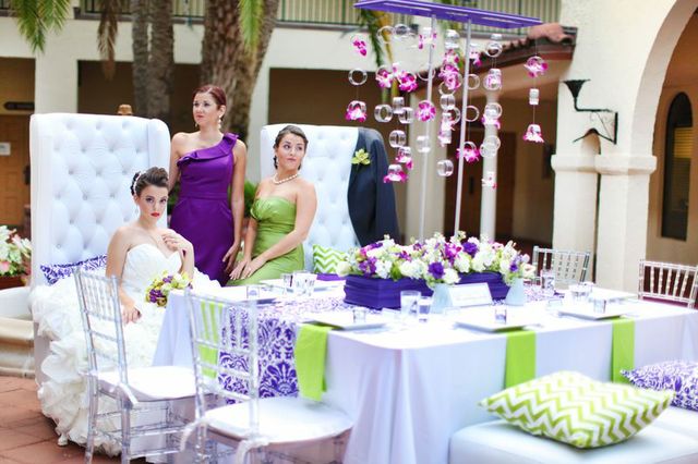 The green and purple color scheme looked amazing on Hitched Event Rentals‘ white chairs and clear chiavari chairs. Flowers By Lesley white rose and purple flower arrangement brought a touch of nature to the modern-styled shoot.