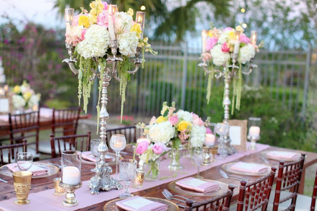 Indoor and outdoor reception areas were set-up and both were equally beautiful. The indoor reception looked like something from a period film, with ivory linens paired with A Chair Affair‘s mahogany brown chiavari chairs, Flowers By Lesley‘s white and pink centerpieces, and Weddings By 2 + Hue‘s accent pieces.