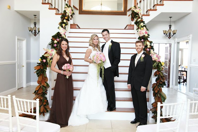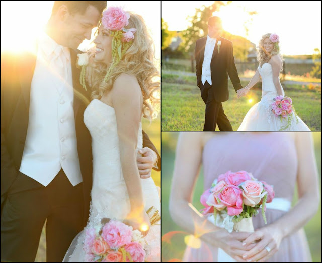 The “couple” married under an arch of roses by Flowers By Lesley. To complete the vintage chic feeling, A Chair Affair used their picturesque church pews. Flowers By Lesley also provided the bride’s and bridesmaid’s stunning peony and rose bouquets. The bride’s Alfred Angelo dress photographed amazingly from every angle and the groom looked snappy in his tuxedo by Absolutely Fitting. The wedding party’s hair and make-up, done by Kristy’s On-Location Makeup Artistry & Hair Design, looked timeless and romantic.
