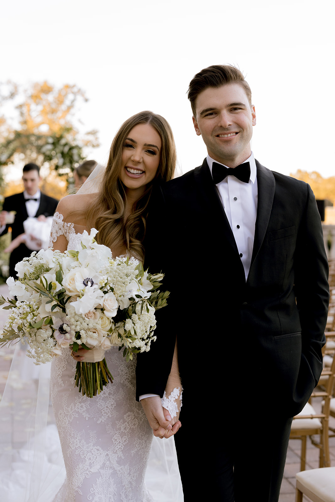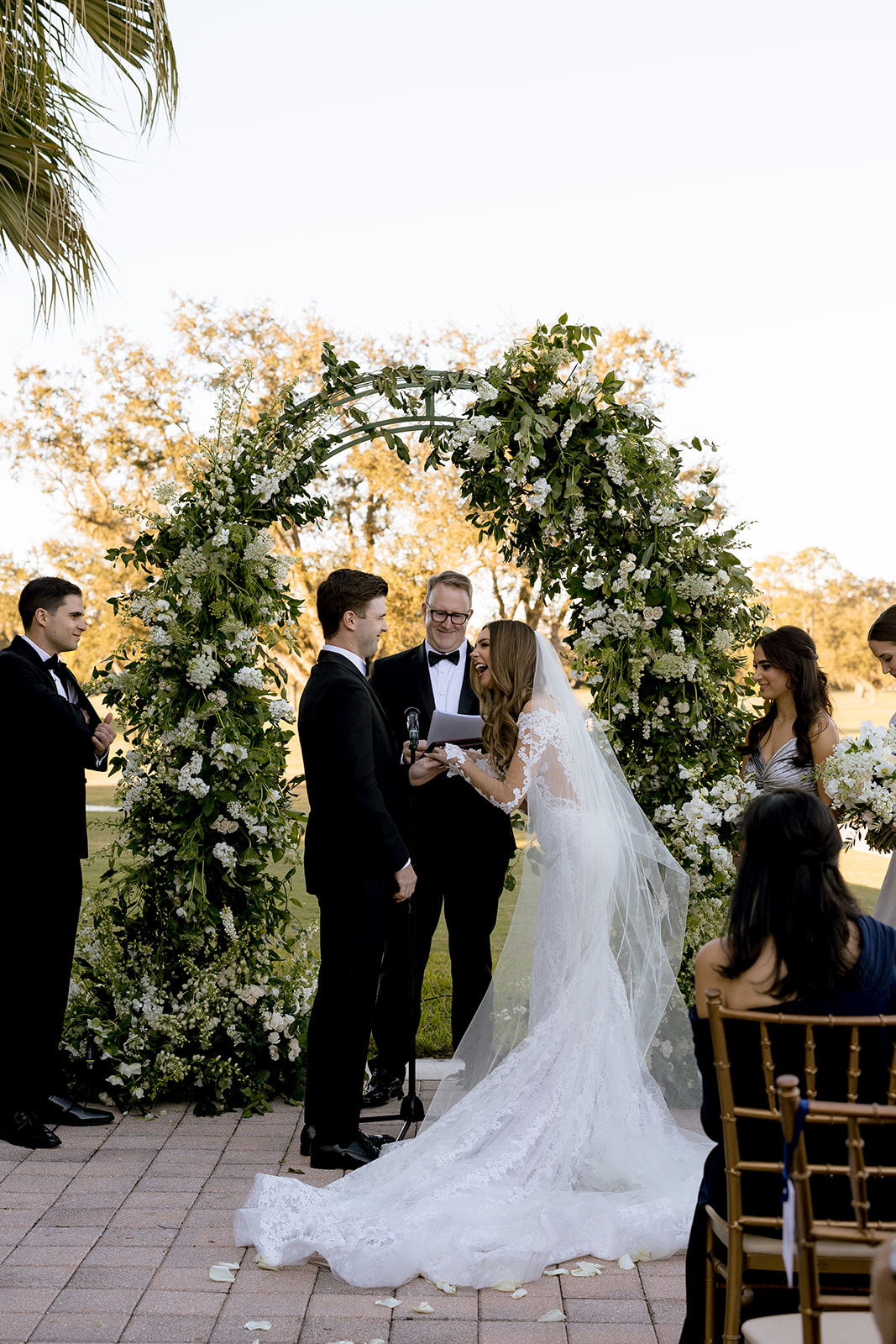 The couple exchanged vows outdoors beneath a stunning floral arch adorned with lush greenery and delicate white blooms. Modern white centerpieces on pedestals lined the ceremony aisle, guiding guests’ gaze toward the heartwarming union.