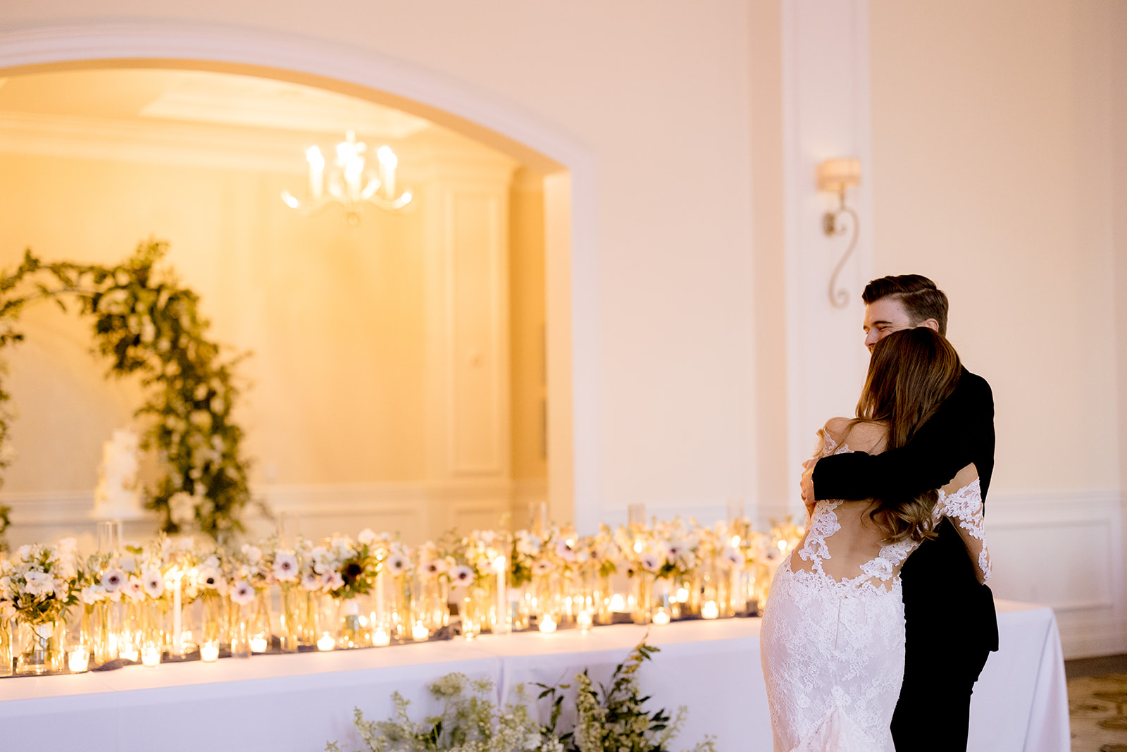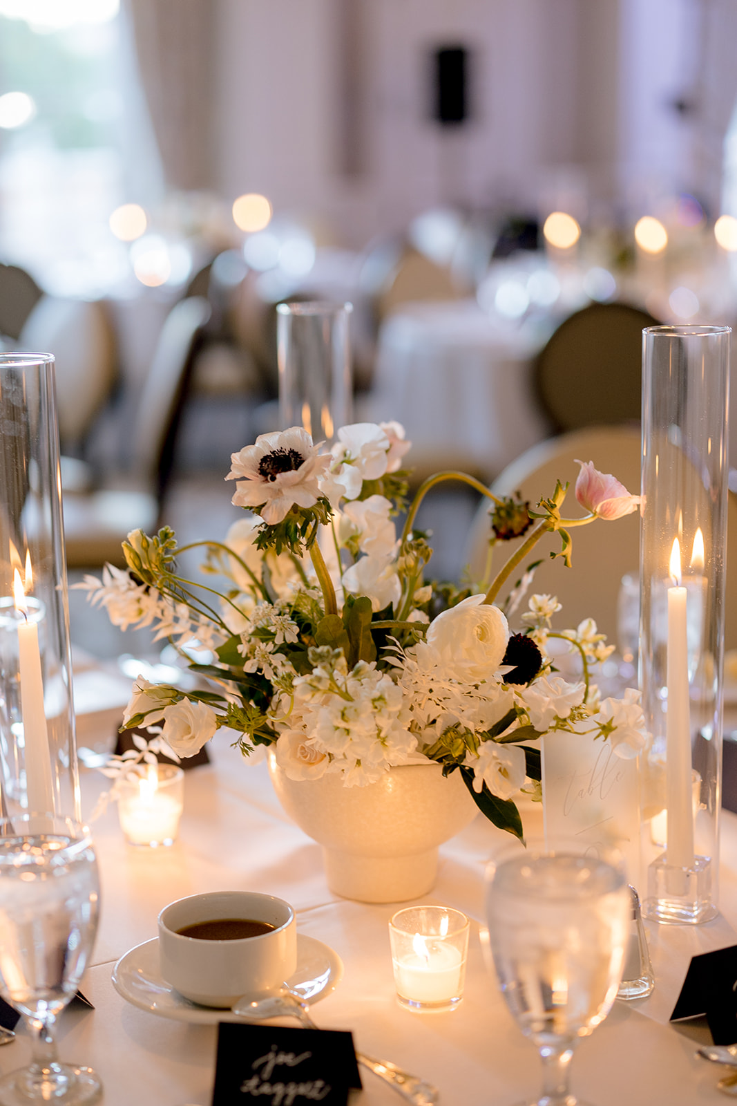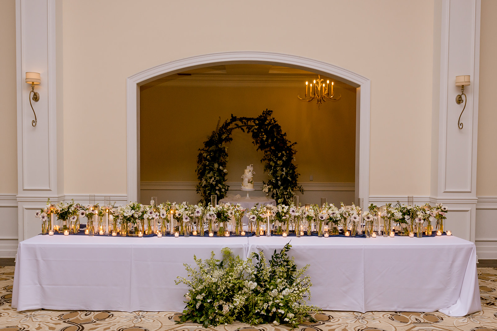 Following the ceremony, the celebration moved indoors to the reception hall, where short compote centerpieces brought an air of sophistication to the guest tables. The head table, adorned with an abundance of candles and delicate bud vases, created an intimate and romantic ambiance.