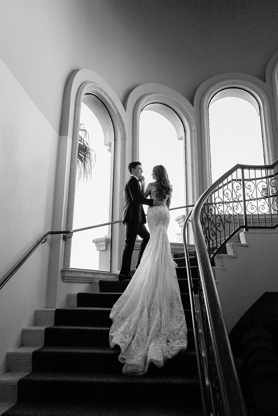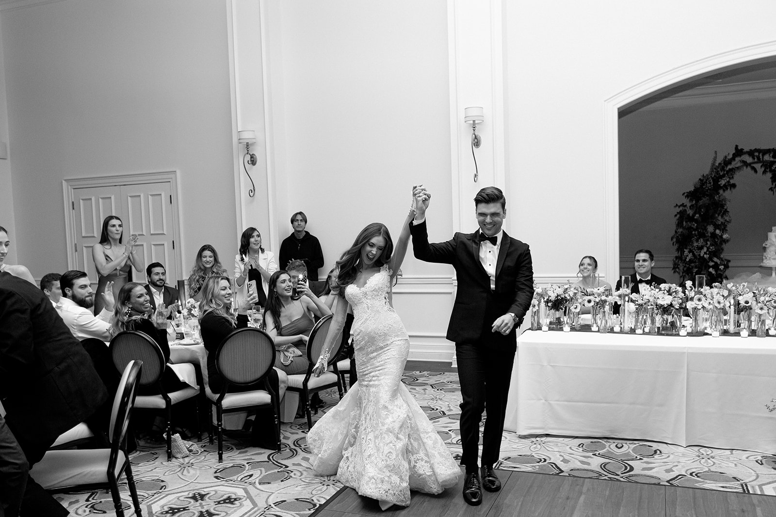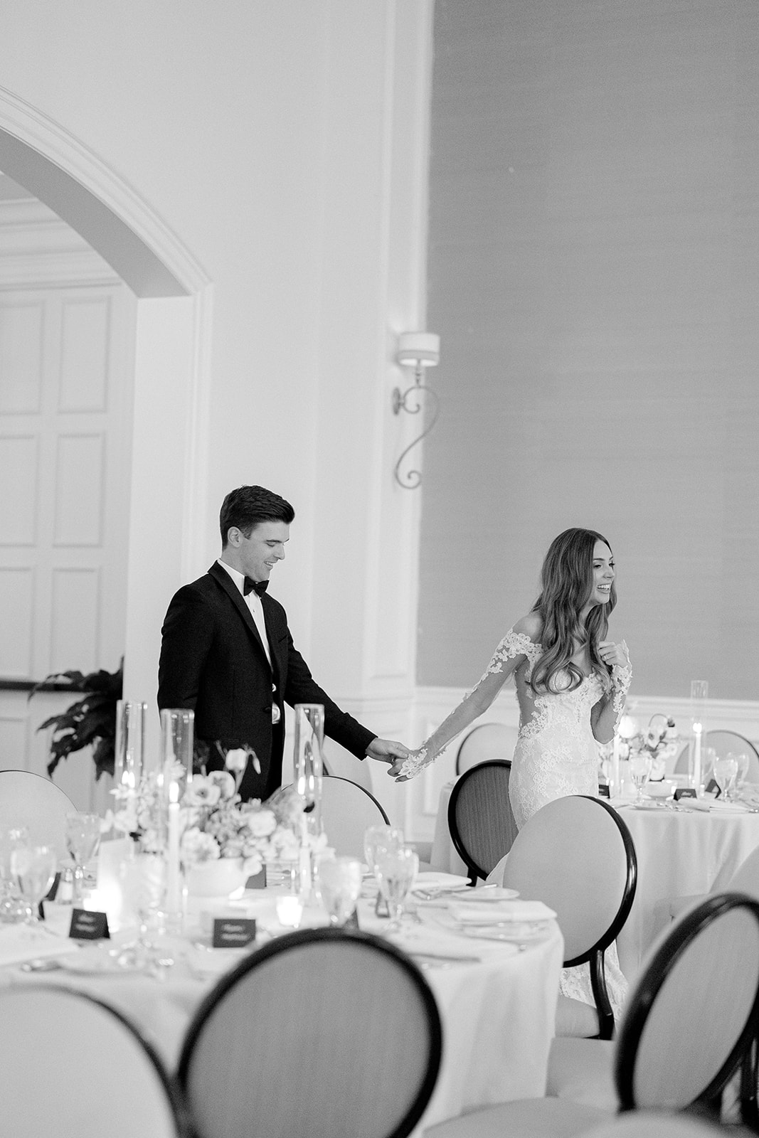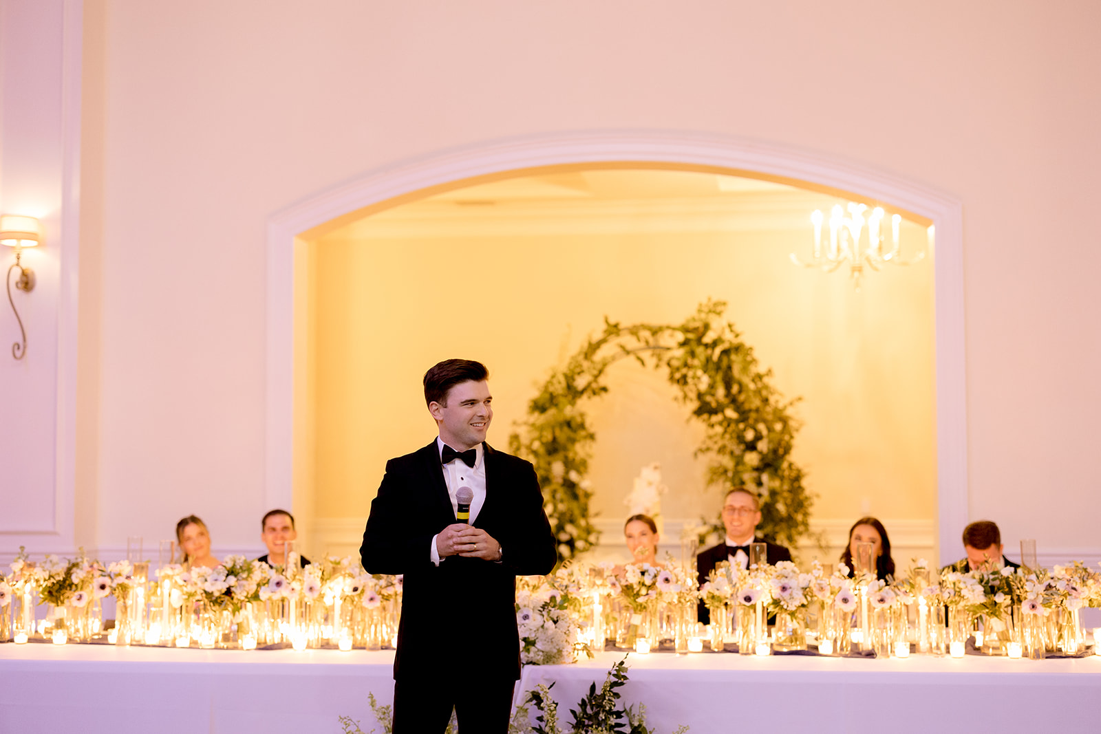 Following the ceremony, the celebration moved indoors to the reception hall, where short compote centerpieces brought an air of sophistication to the guest tables. The head table, adorned with an abundance of candles and delicate bud vases, created an intimate and romantic ambiance.
