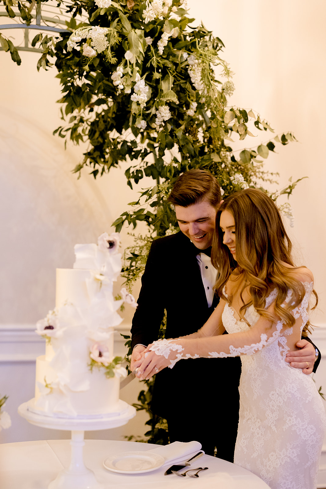 A standout feature of the day was the repurposing of the floral arch from the ceremony as the backdrop for the couple’s wedding cake, showcasing their commitment to cherishing every moment of their special day.