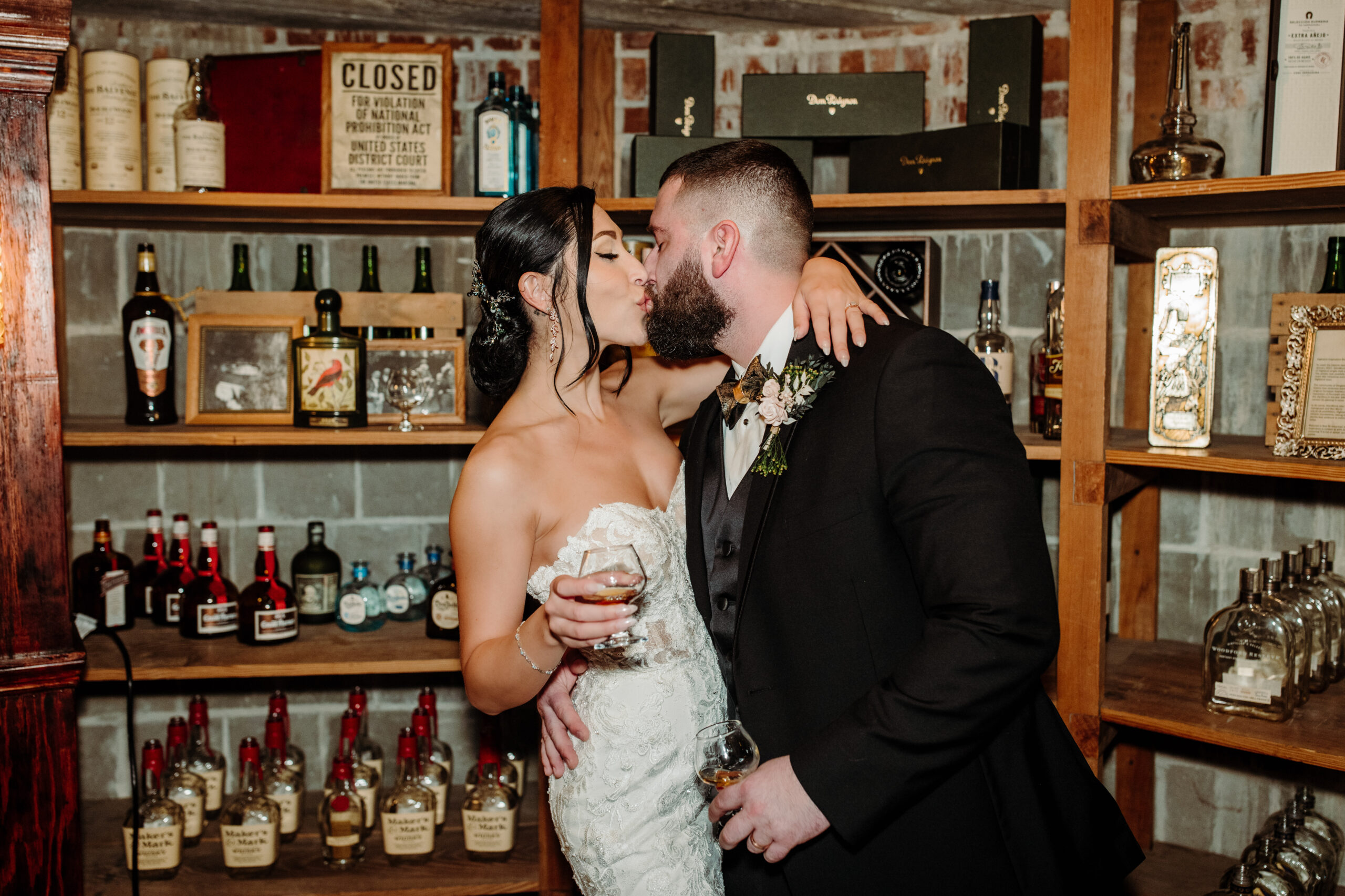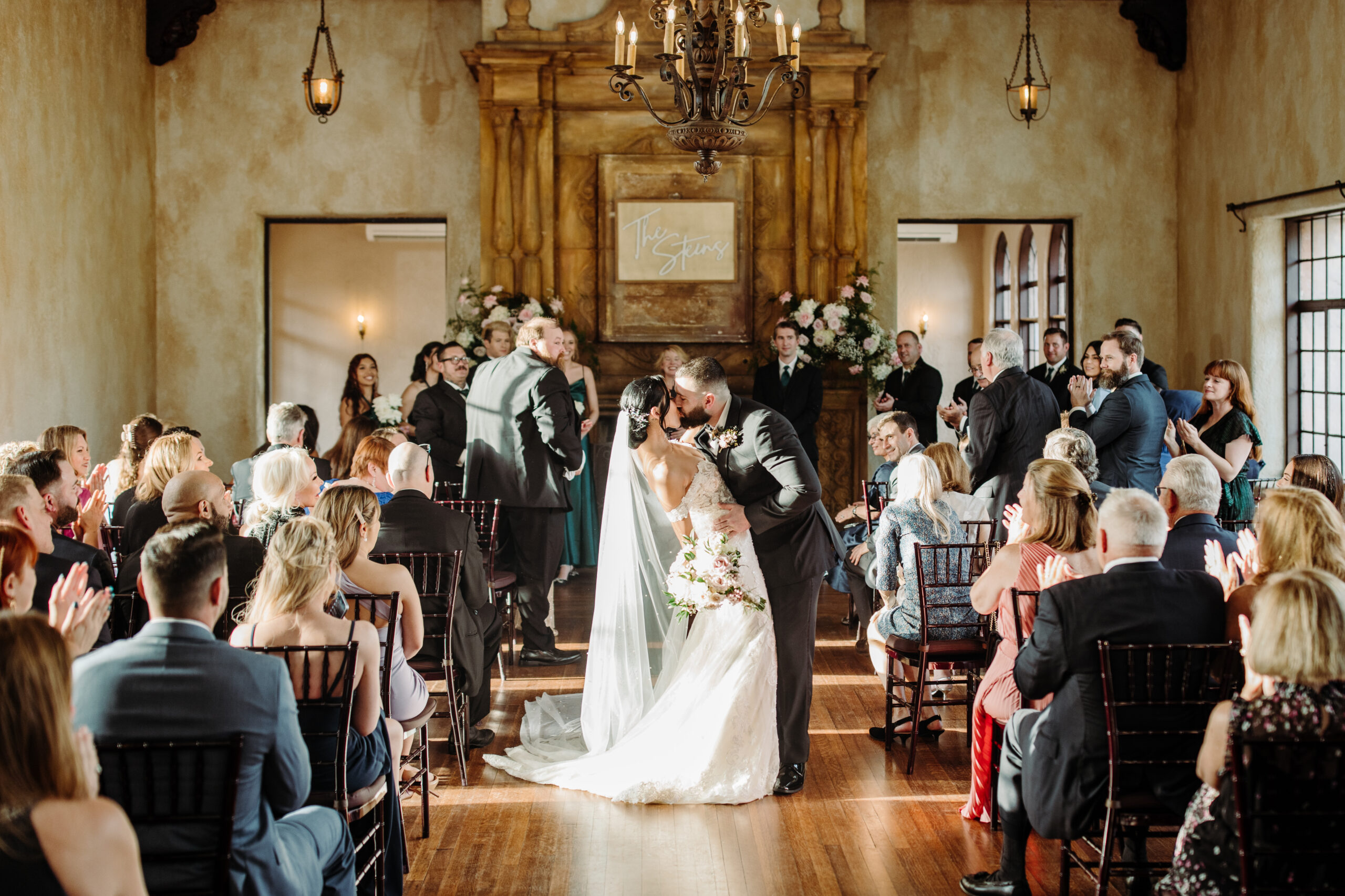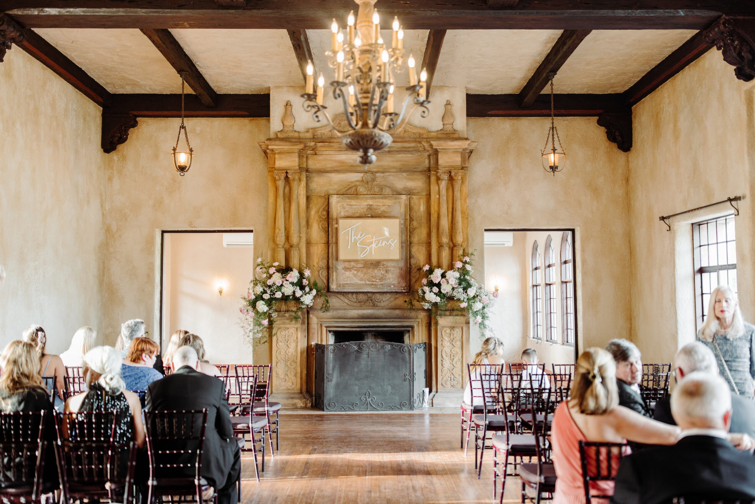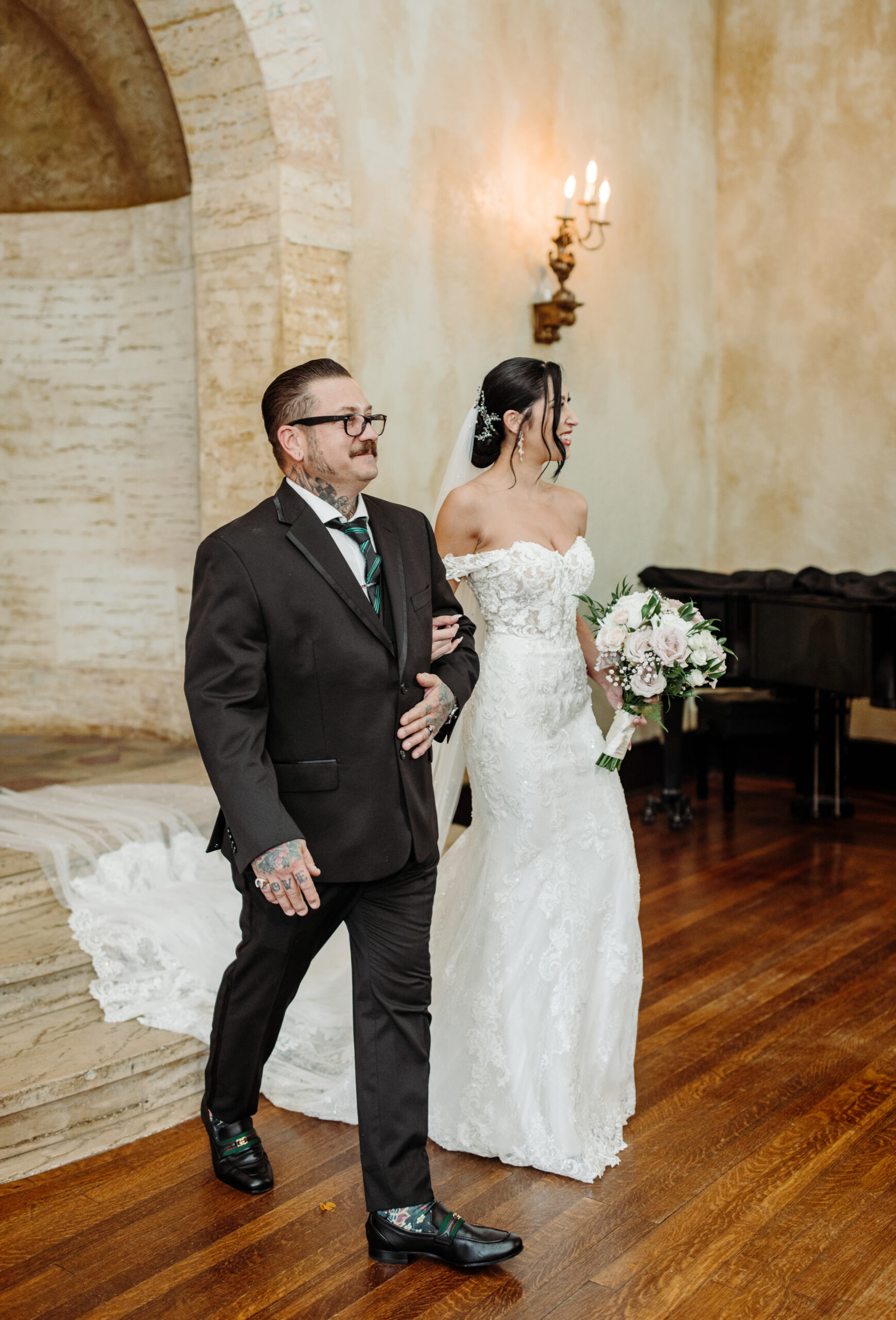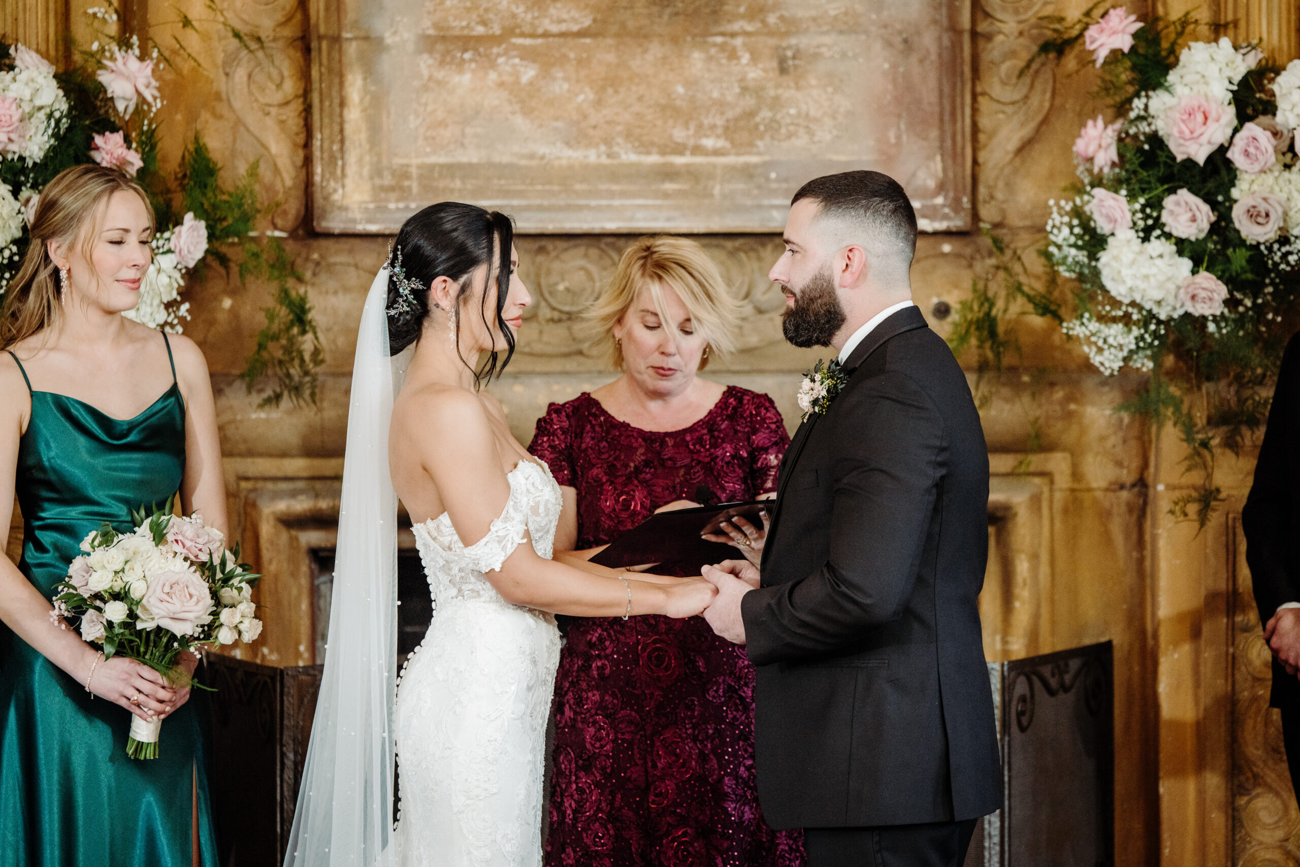 The couple exchanged vows in an intimate indoor ceremony in the mansion’s grand ballroom, where the ornate fireplace served as their altar, glowing with soft candlelight and framed by lush greenery and floral accents. The timeless architecture of the space, paired with vintage touches, created a romantic atmosphere that felt both regal and personal.
