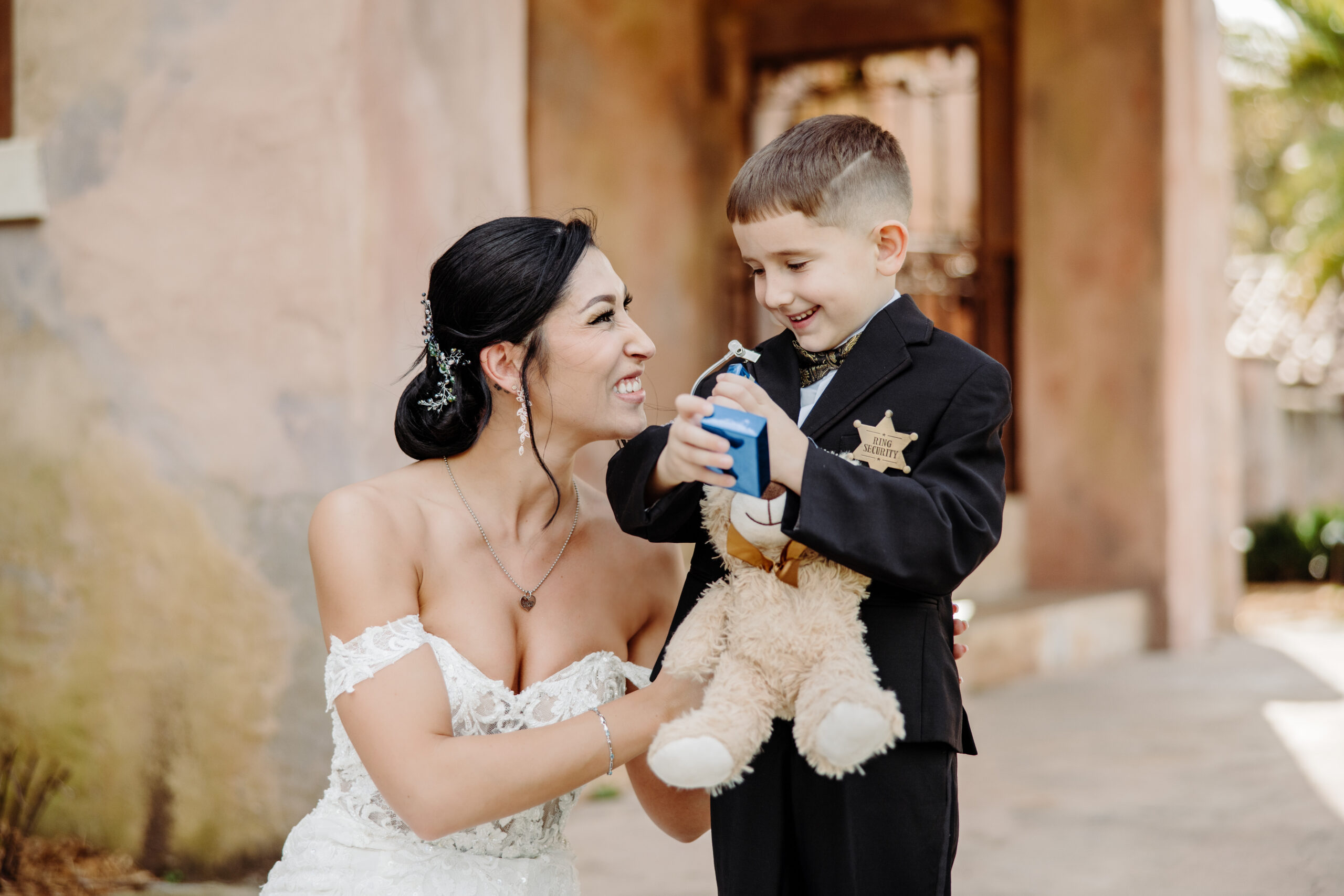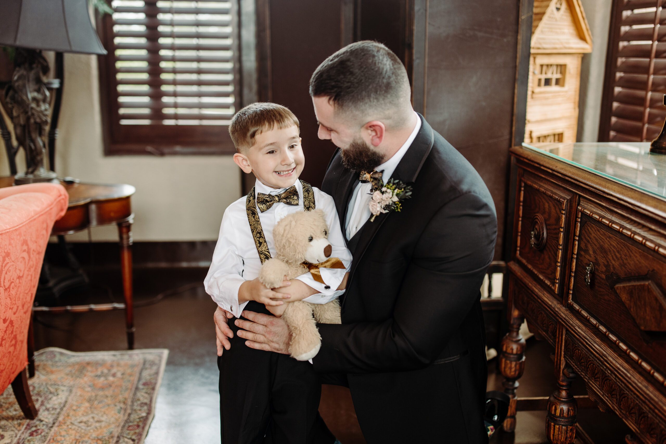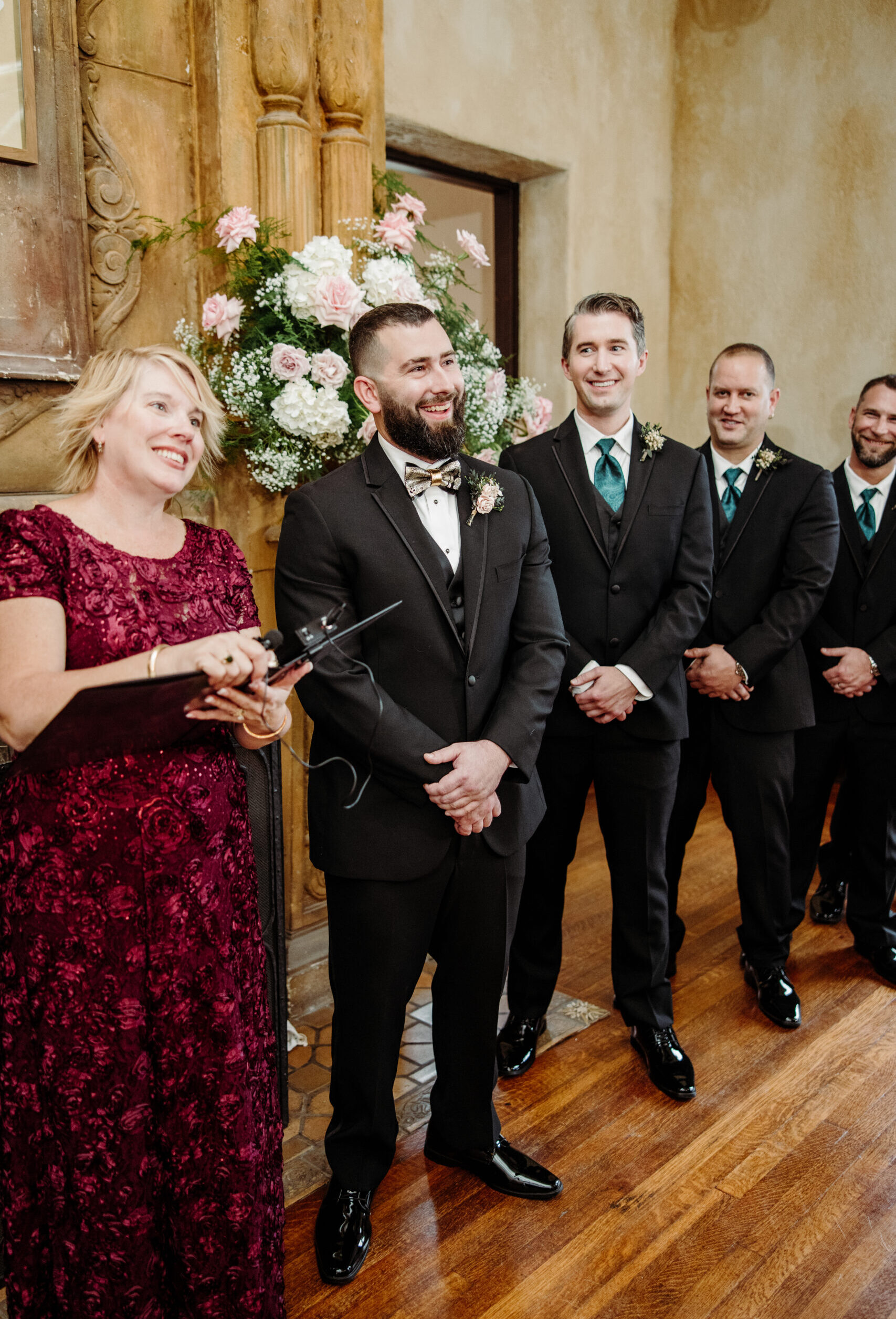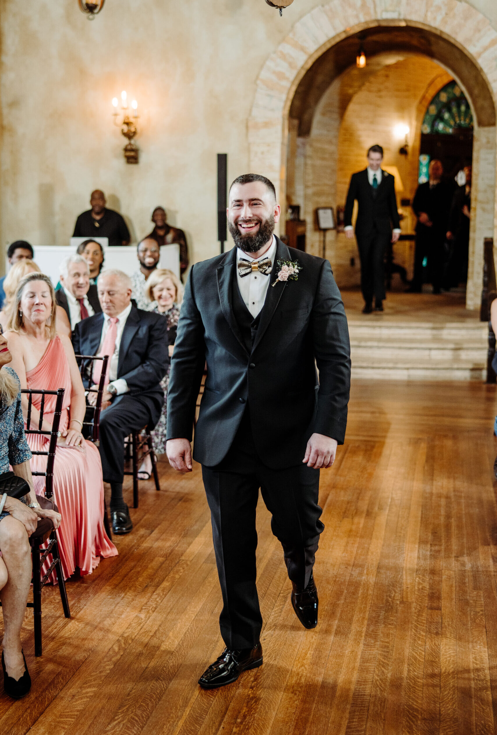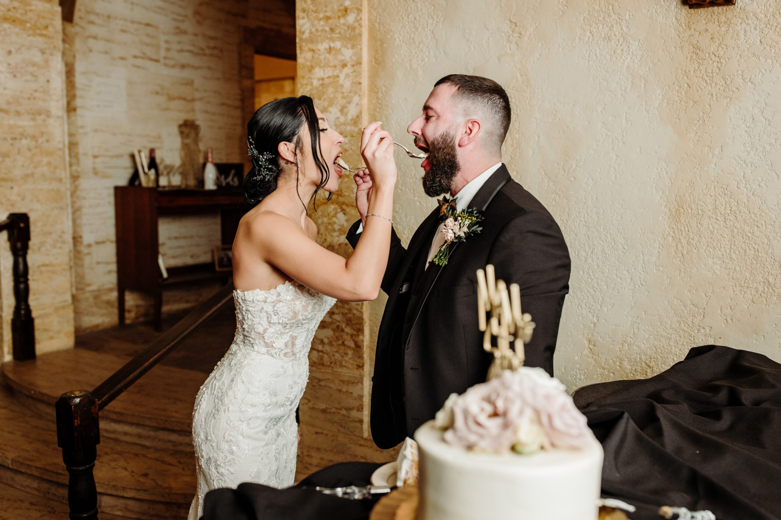 The couple exchanged vows in an intimate indoor ceremony in the mansion’s grand ballroom, where the ornate fireplace served as their altar, glowing with soft candlelight and framed by lush greenery and floral accents. The timeless architecture of the space, paired with vintage touches, created a romantic atmosphere that felt both regal and personal.