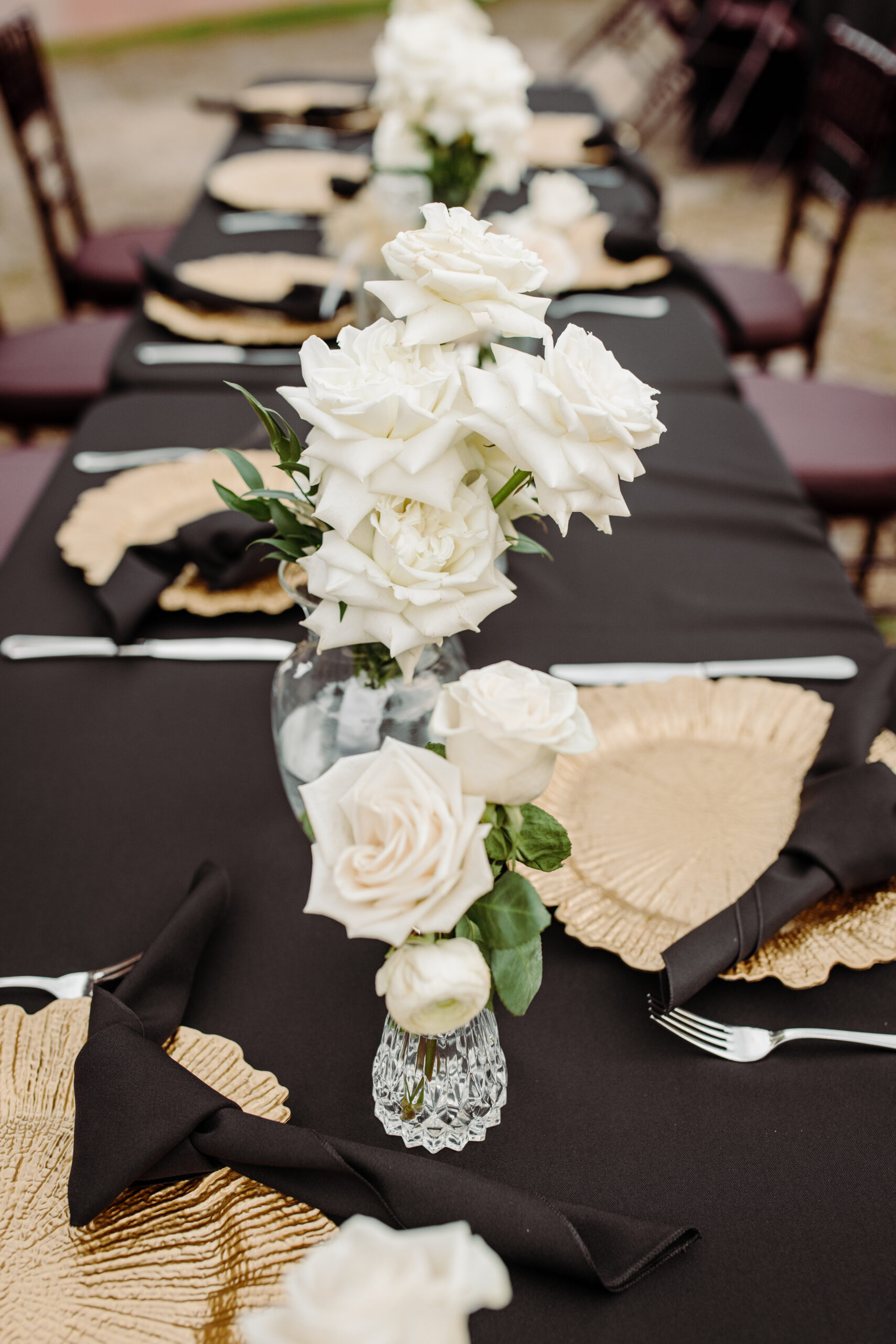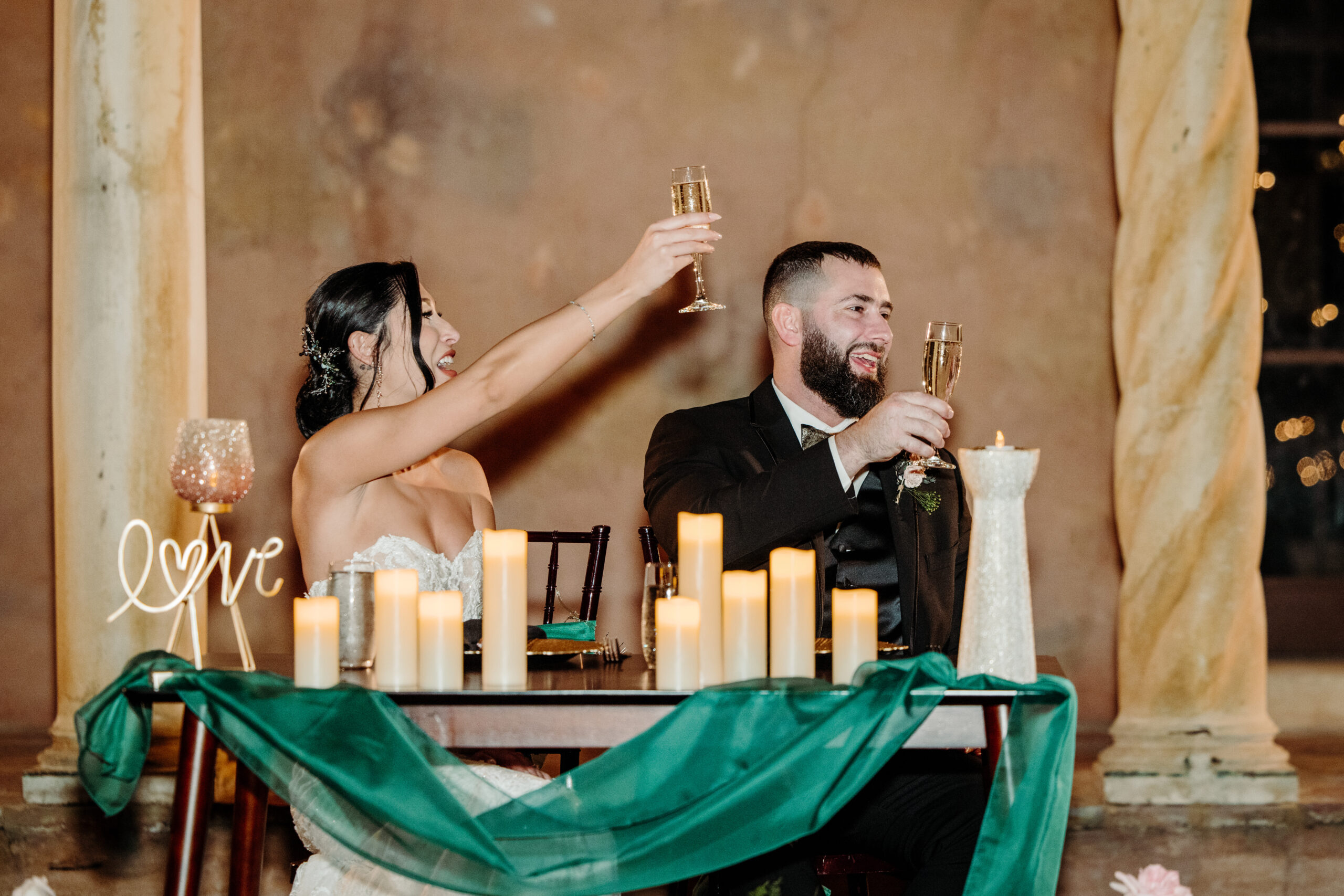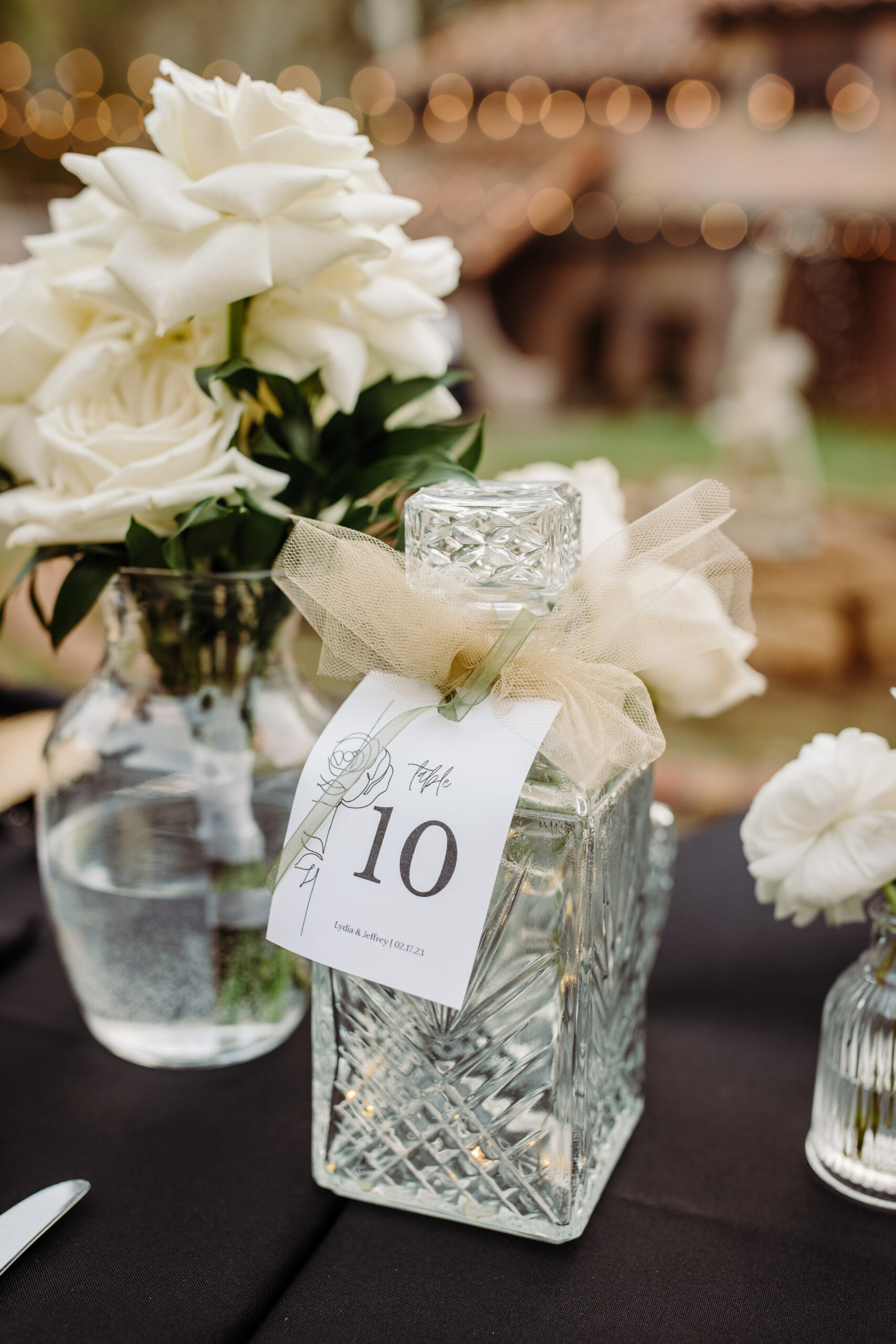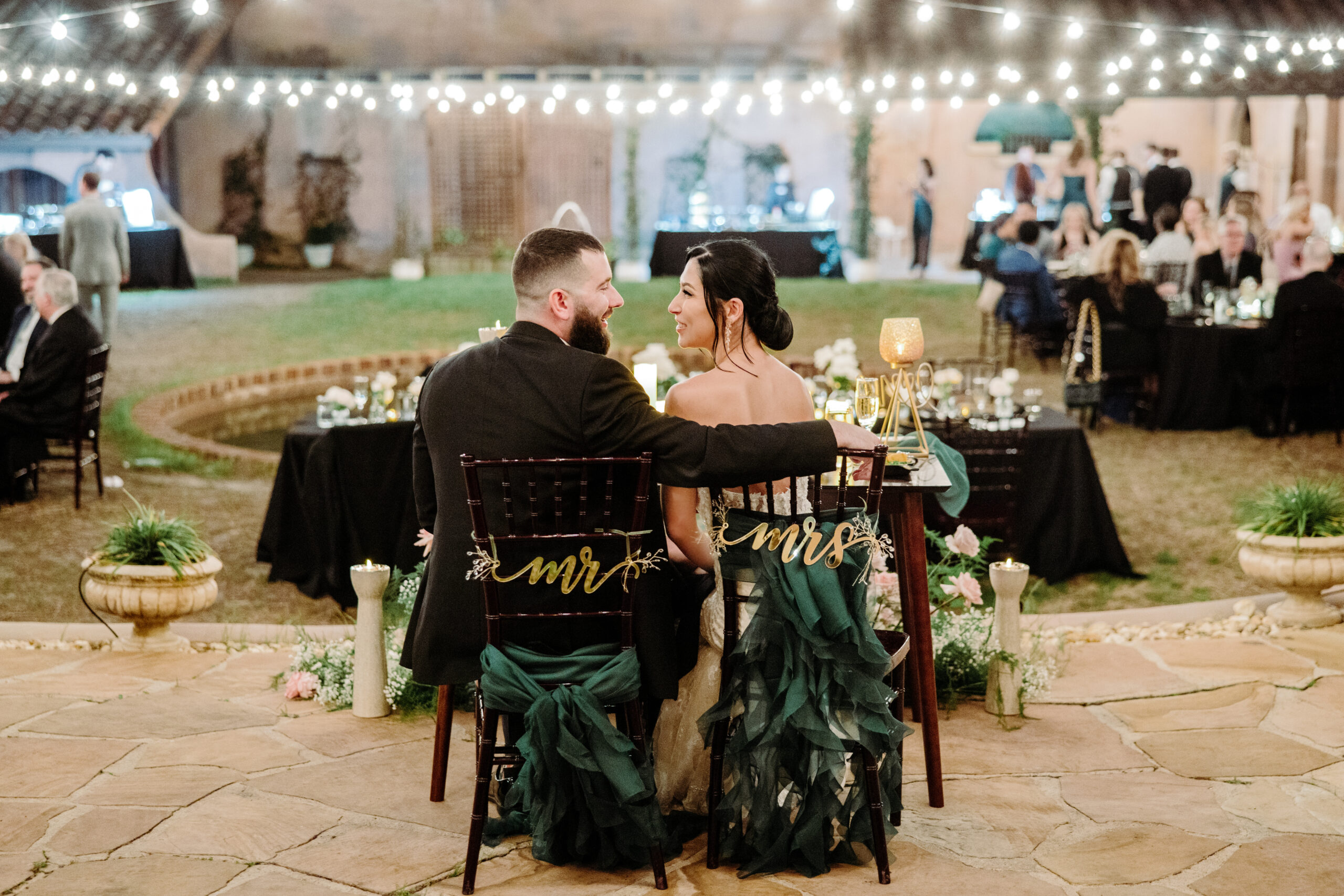 After the heartfelt ceremony, guests were welcomed to the historic terrace for cocktail hour and then into the courtyard for dinner under the stars. Each table was adorned with vintage glass decanters, a nod to Lydia and Jeffrey’s love for timeless details. These unique centerpieces, paired with soft candlelight and elegant table settings, created a warm and nostalgic ambiance. Touches of black, gold, and emerald were woven throughout the décor — from velvet napkins and gilded chargers to the emerald glassware and moody floral accents — adding richness and drama to the evening’s palette.