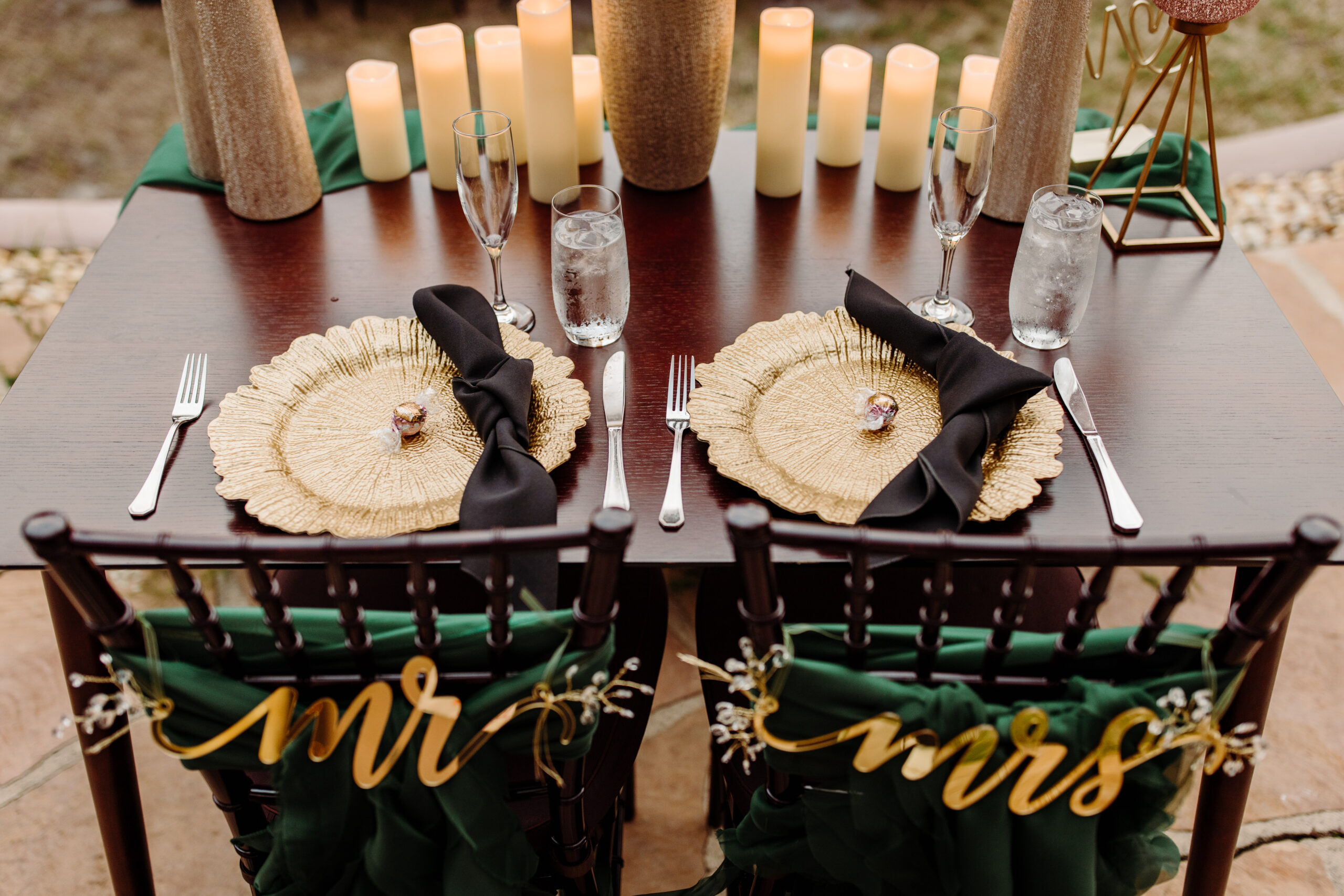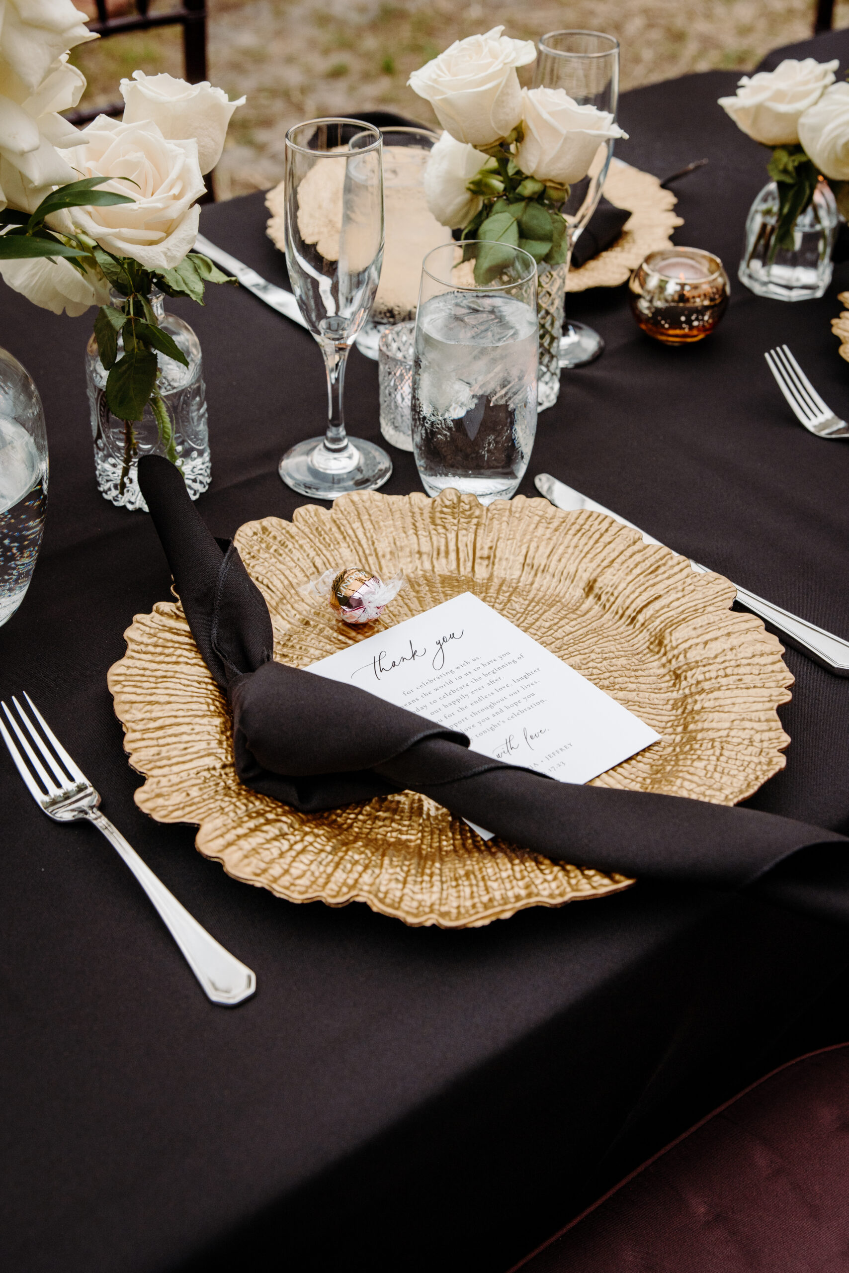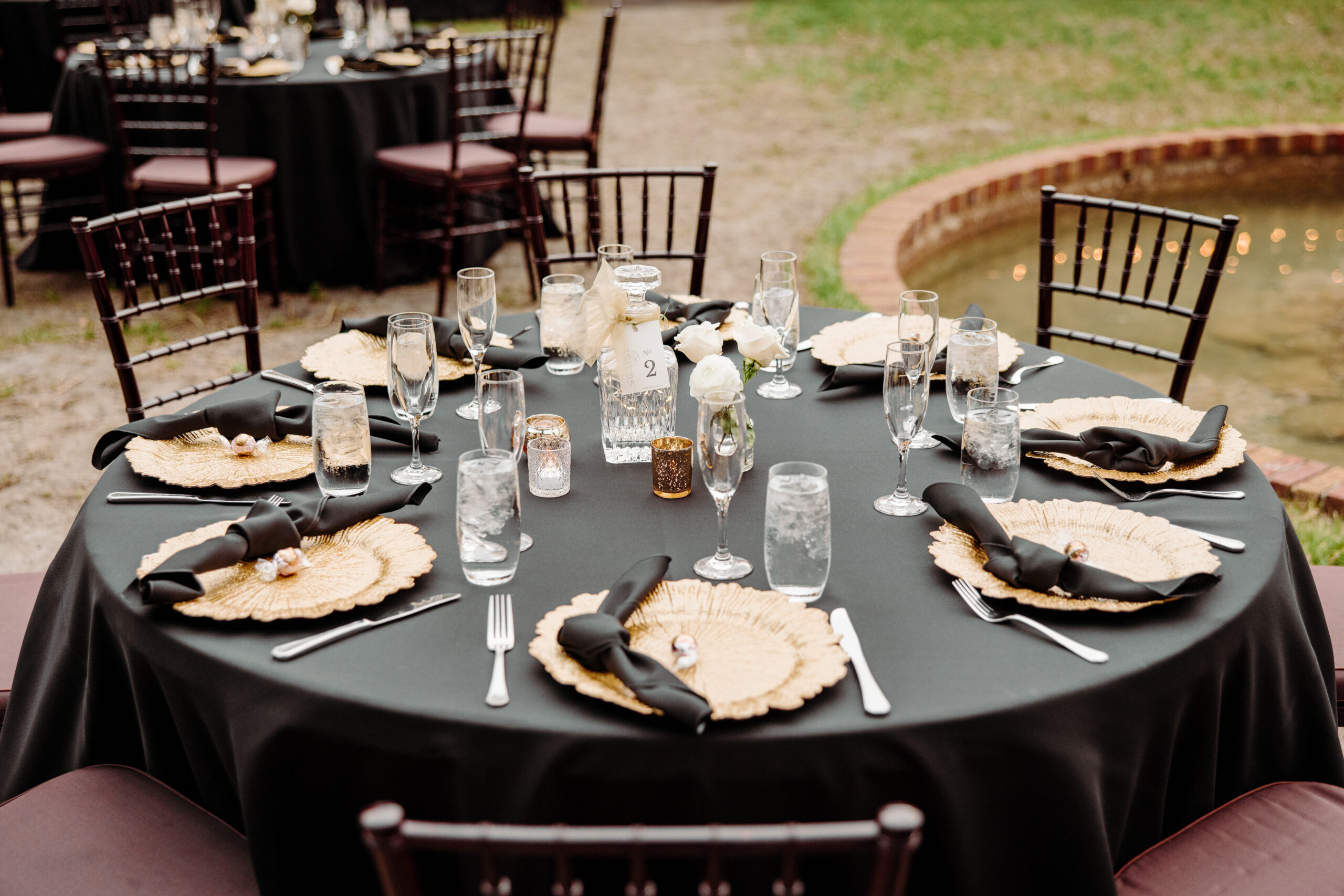 After the heartfelt ceremony, guests were welcomed to the historic terrace for cocktail hour and then into the courtyard for dinner under the stars. Each table was adorned with vintage glass decanters, a nod to Lydia and Jeffrey’s love for timeless details. These unique centerpieces, paired with soft candlelight and elegant table settings, created a warm and nostalgic ambiance. Touches of black, gold, and emerald were woven throughout the décor — from velvet napkins and gilded chargers to the emerald glassware and moody floral accents — adding richness and drama to the evening’s palette.