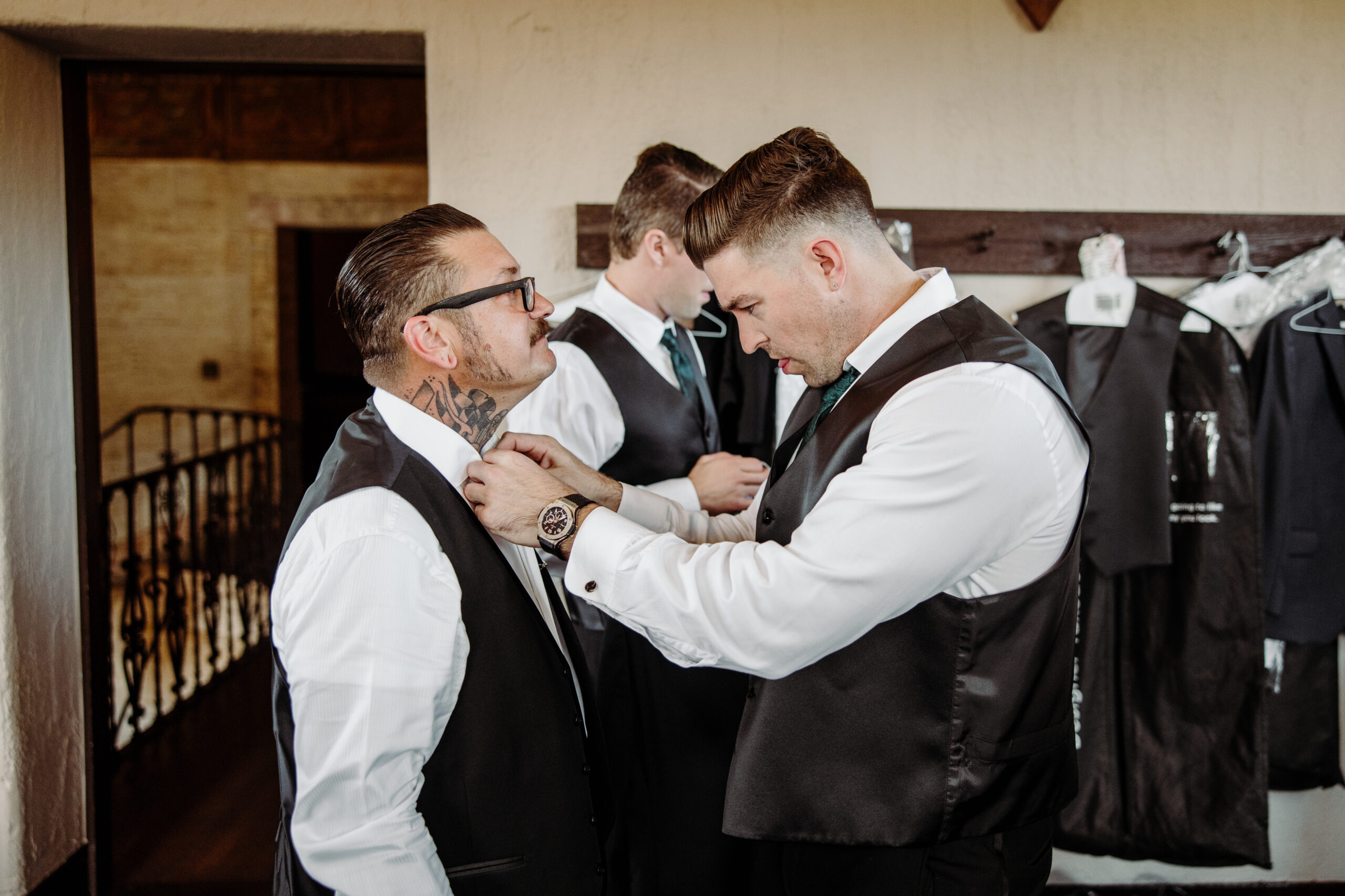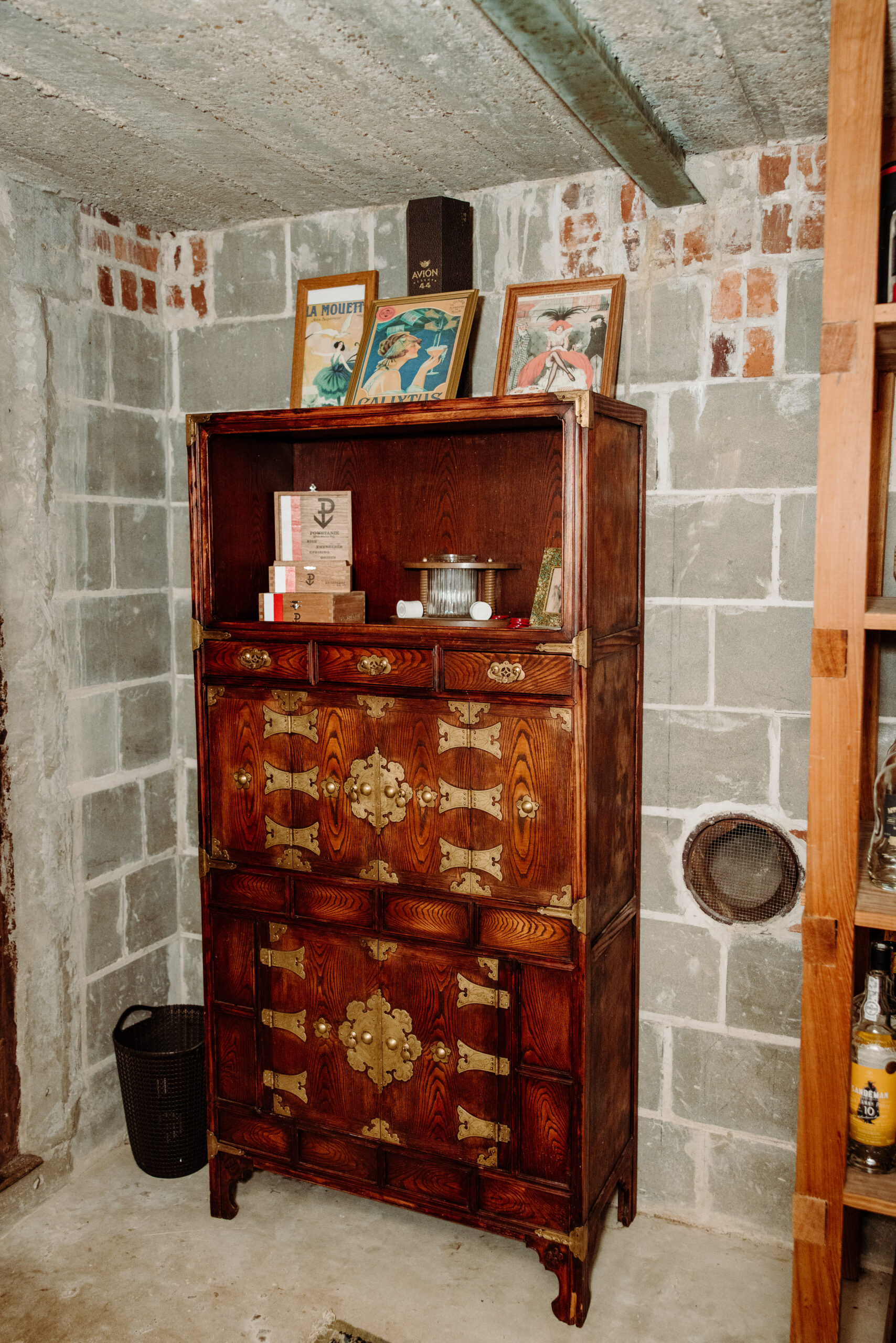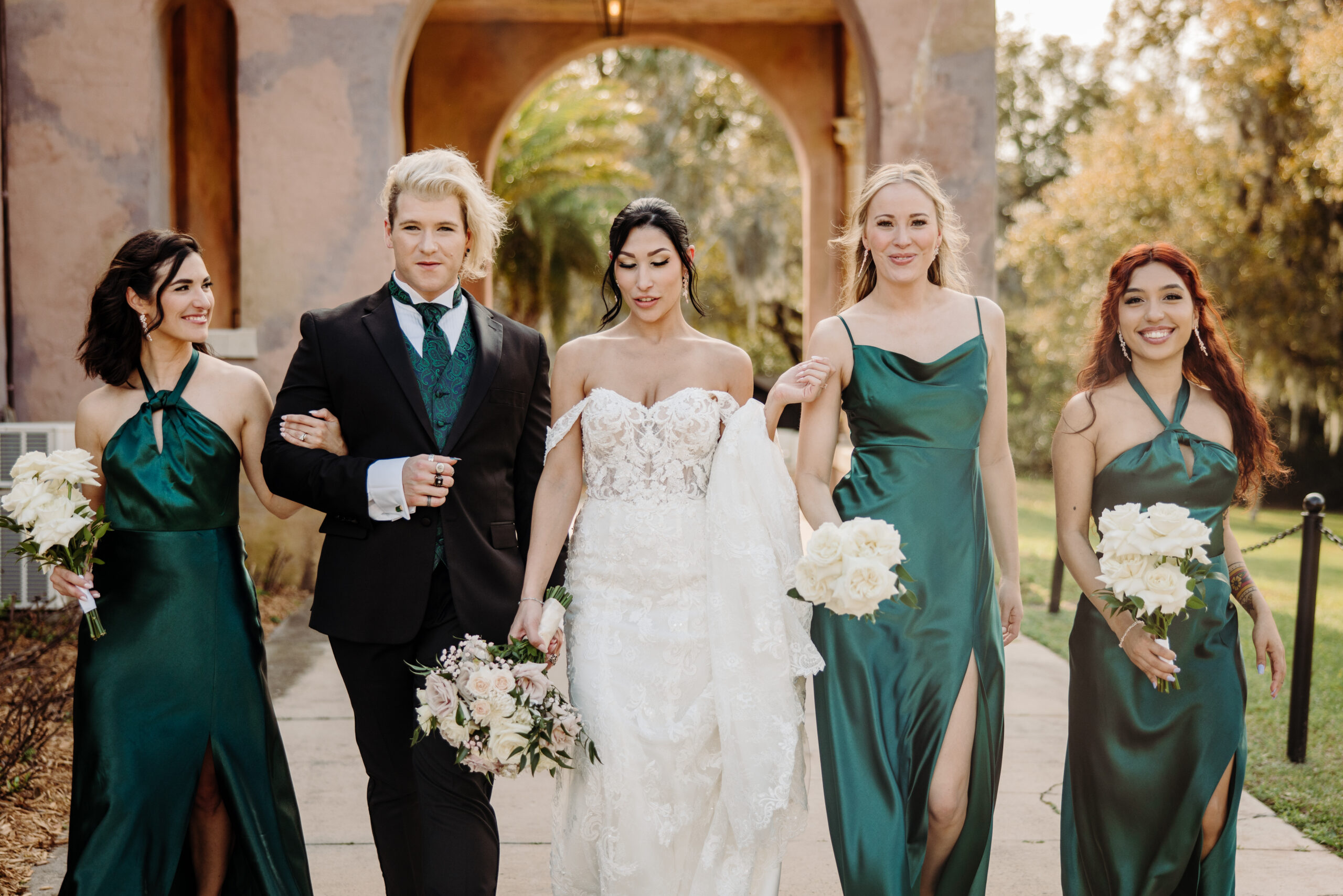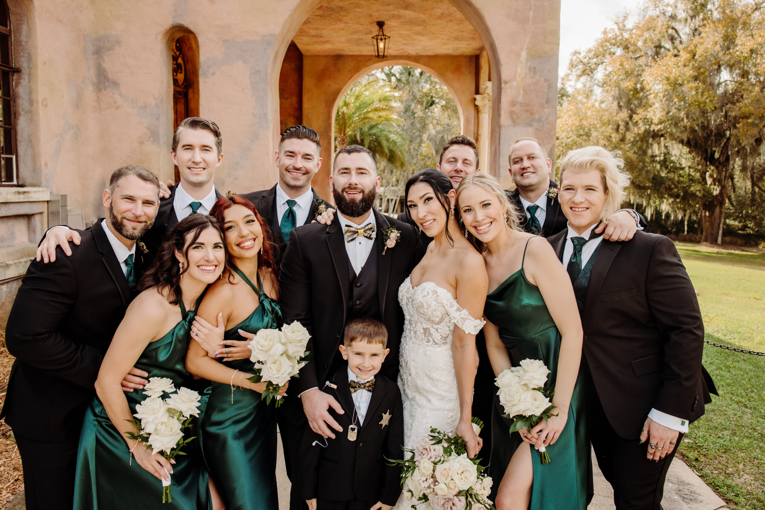 After the heartfelt ceremony, guests were welcomed to the historic terrace for cocktail hour and then into the courtyard for dinner under the stars. Each table was adorned with vintage glass decanters, a nod to Lydia and Jeffrey’s love for timeless details. These unique centerpieces, paired with soft candlelight and elegant table settings, created a warm and nostalgic ambiance. Touches of black, gold, and emerald were woven throughout the décor — from velvet napkins and gilded chargers to the emerald glassware and moody floral accents — adding richness and drama to the evening’s palette.