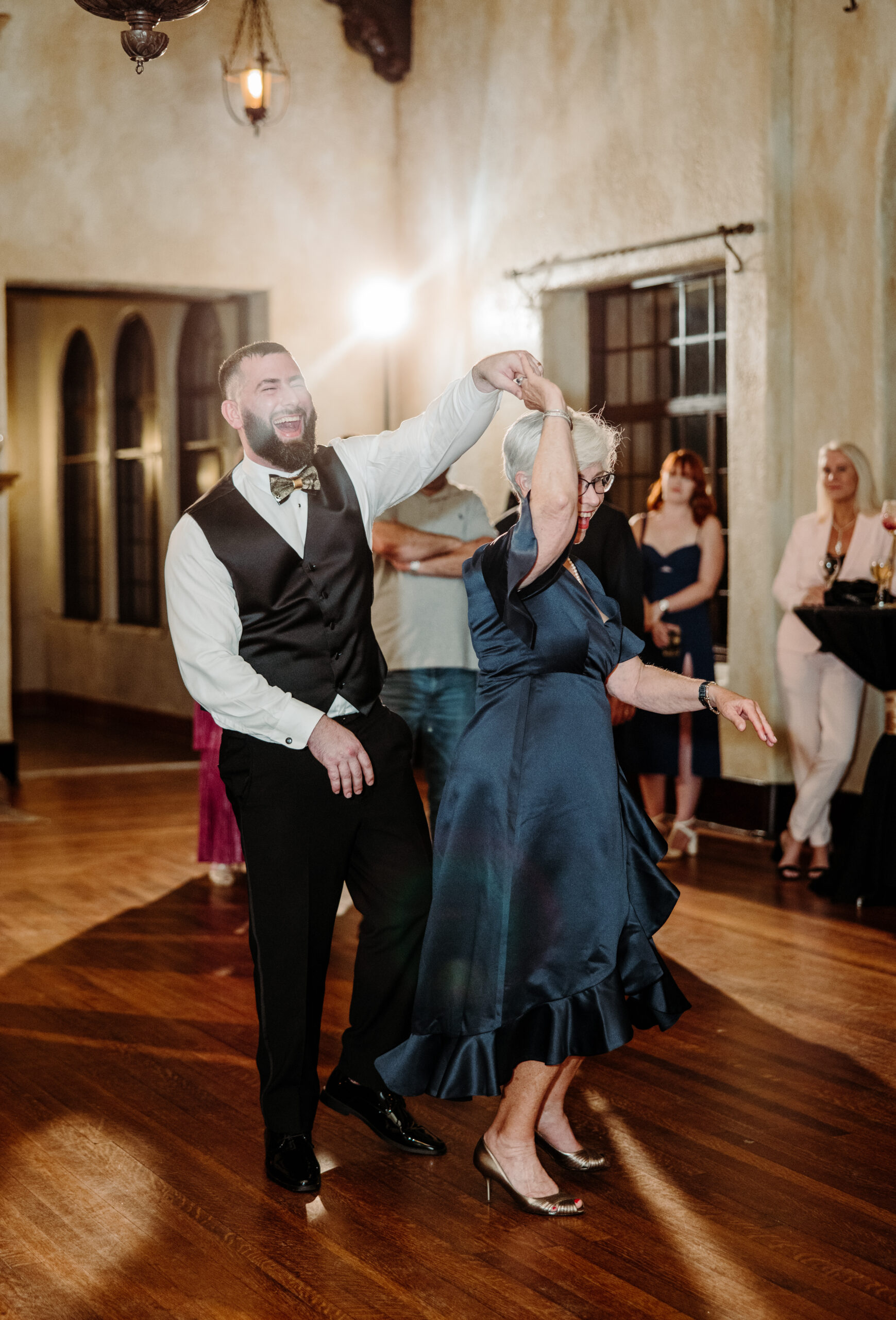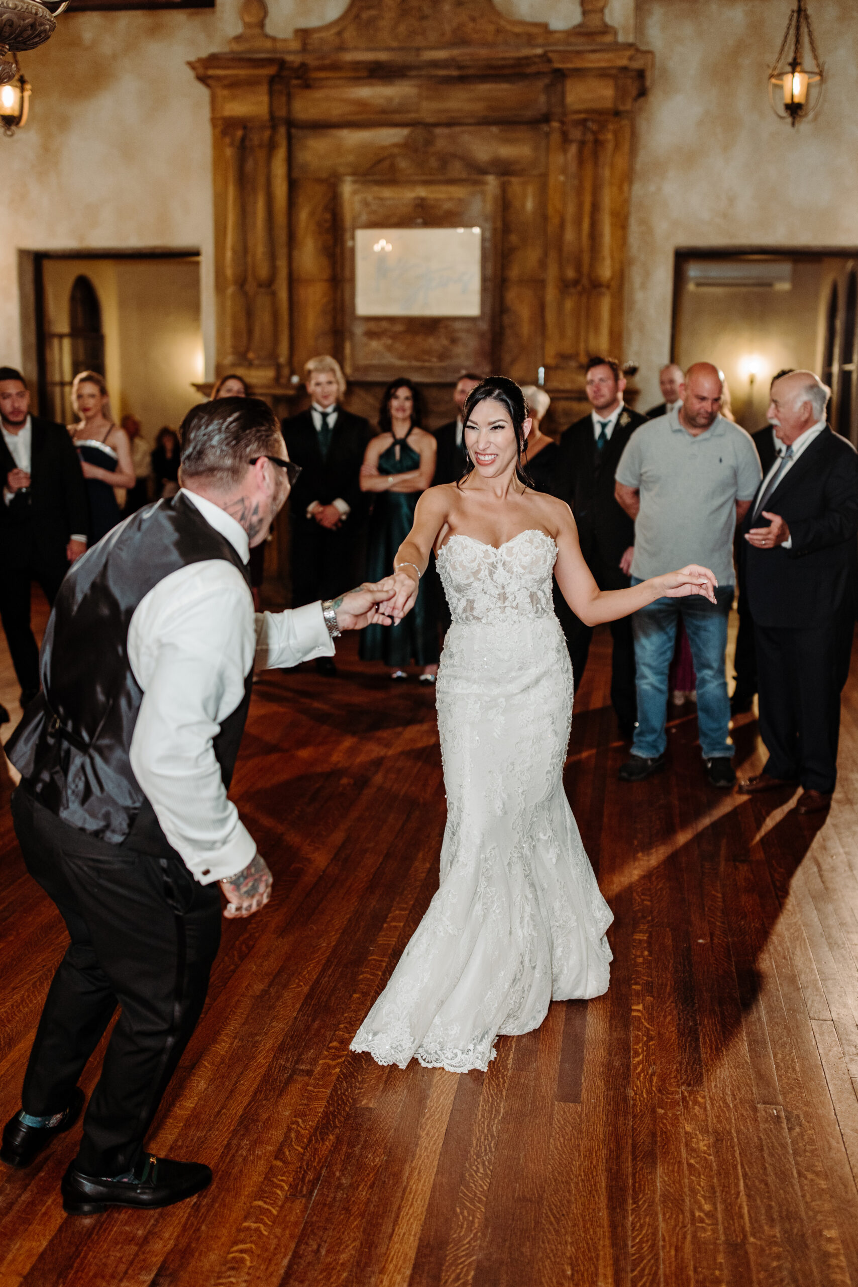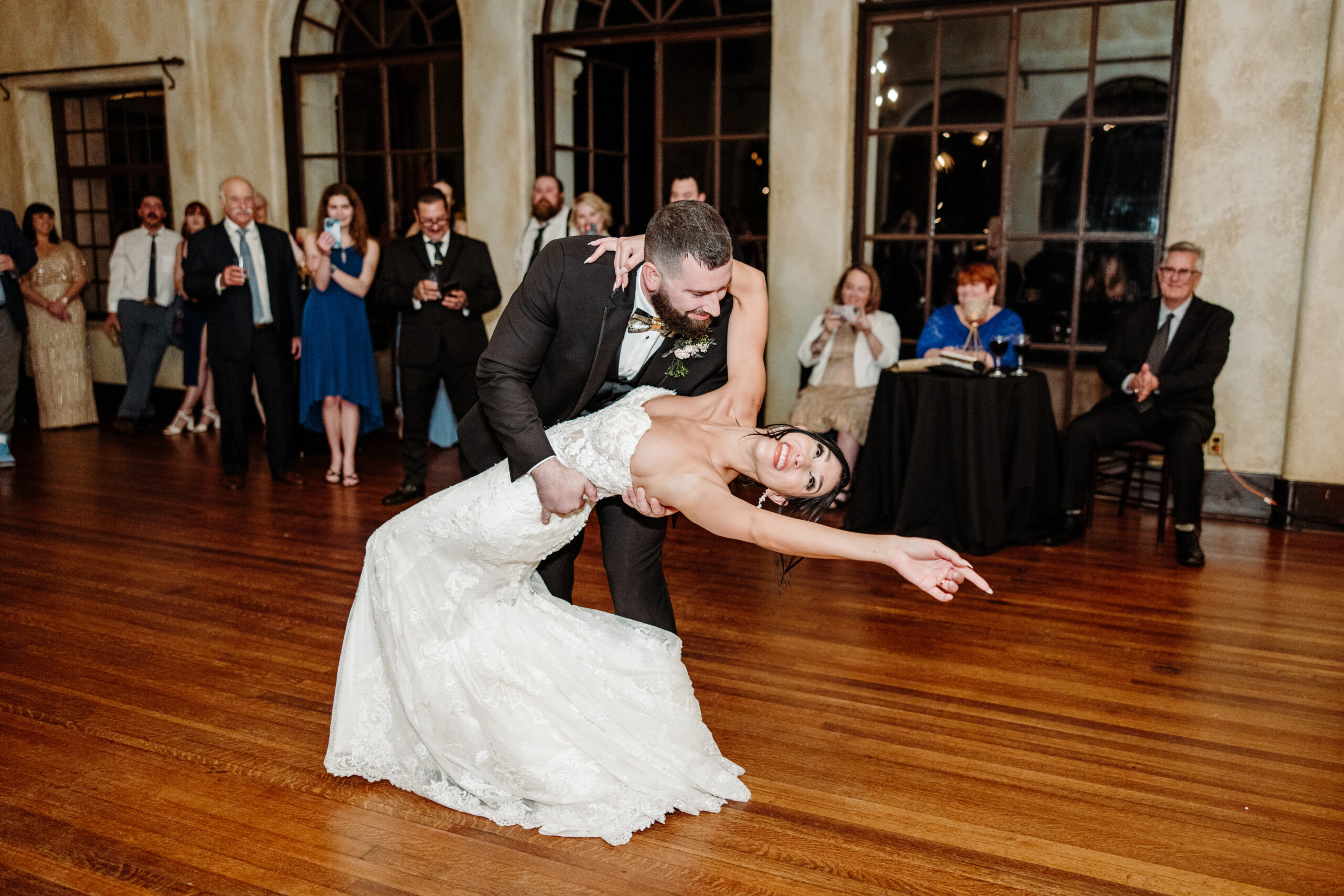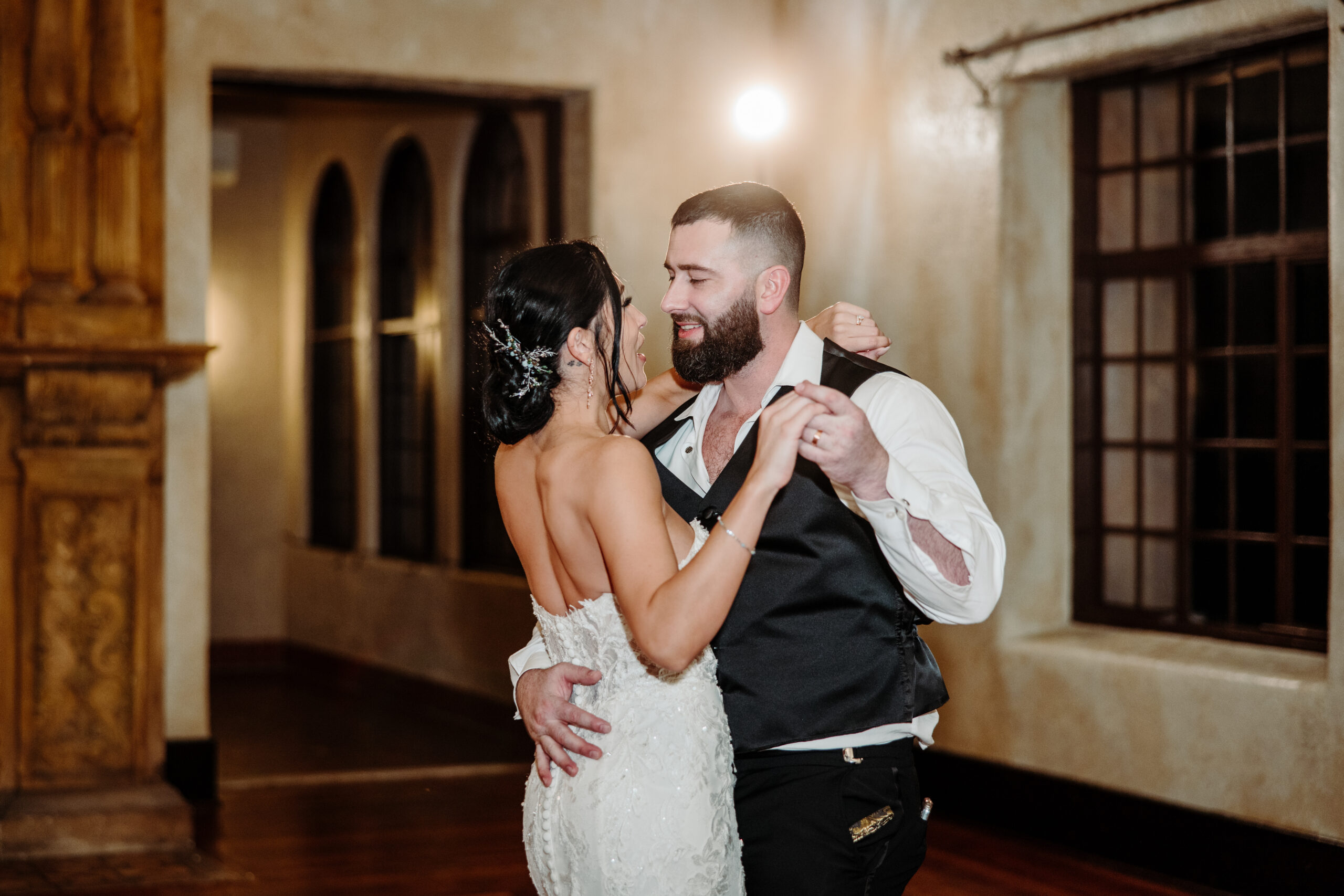 As the sun set over the mansion, guests were invited back into the ballroom for dancing, where vintage elegance gave way to celebration. The room sparkled with golden accents and candlelight as Lydia and Jeffrey shared their first dance, surrounded by the very walls where they said “I do.”