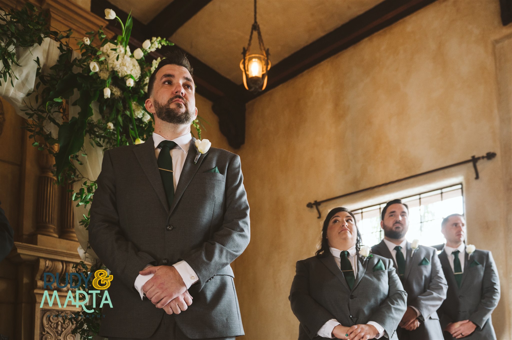 While the bride, groom, and wedding party spent the afternoon getting ready upstairs at The Howey Mansion, the vendors were downstairs working magic to bring their classic white and green wedding ceremony to life in the ballroom. The grand fireplace was framed with a stunning arch, the aisles accented with lanterns and greenery, and the end of the aisle was brought to life with gold pedestals topped with stunning floral arrangements.
