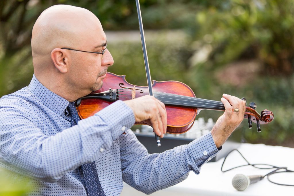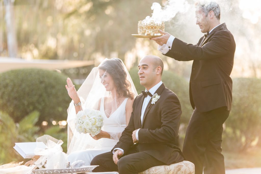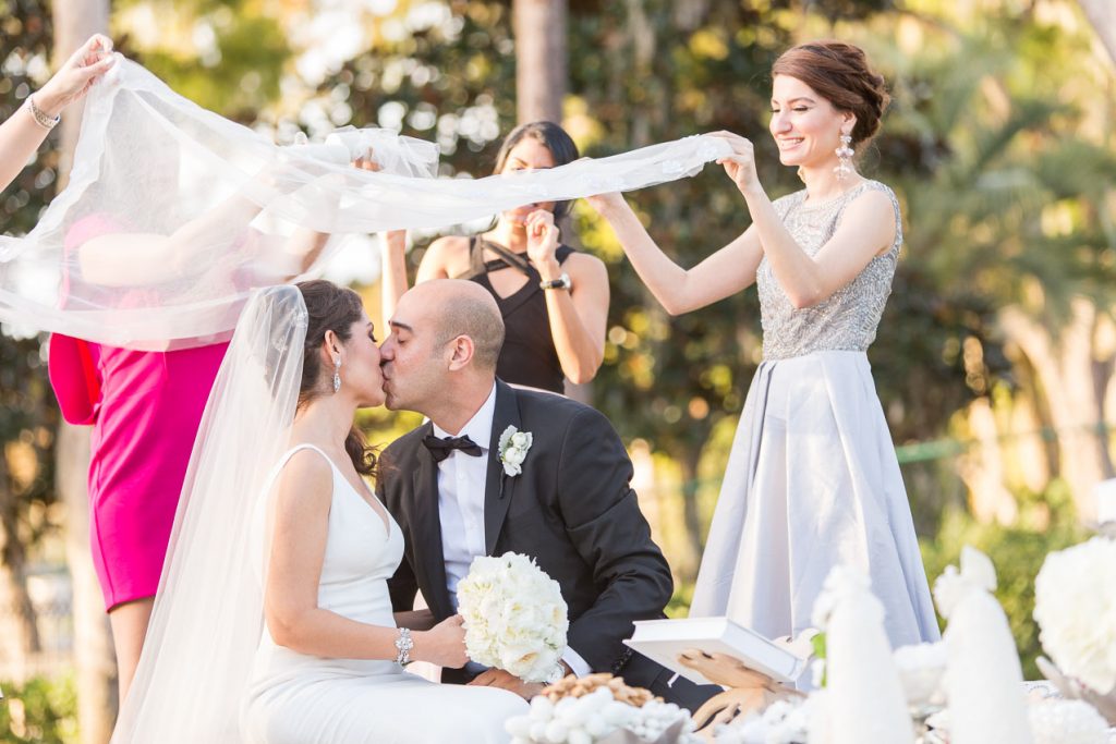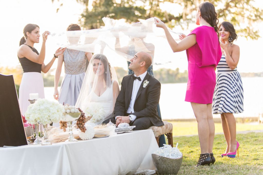 The outdoor ceremony space was full of gorgeous traditional details. As a violinist played, Haleh and Arash made their entrance, then shared in the Persian ceremony, a veil held over their heads throughout. It was an absolutely beautiful mix of traditional and modern elements, from decor to attire to the ceremony itself.