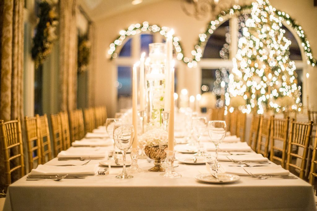 The reception space was absolutely glowing with candles, chandeliers, golden accents, and a huge lit-up tree. We kept it simple with clean white linens, silver & gold details, and simple white floral arrangements. Even the cake from Cut the Cake was a simple white multi-tiered creation, but with the beautiful accent of streaks of gold.